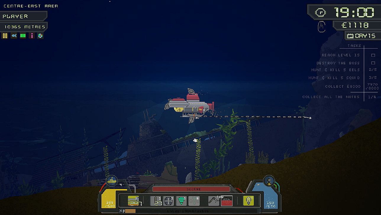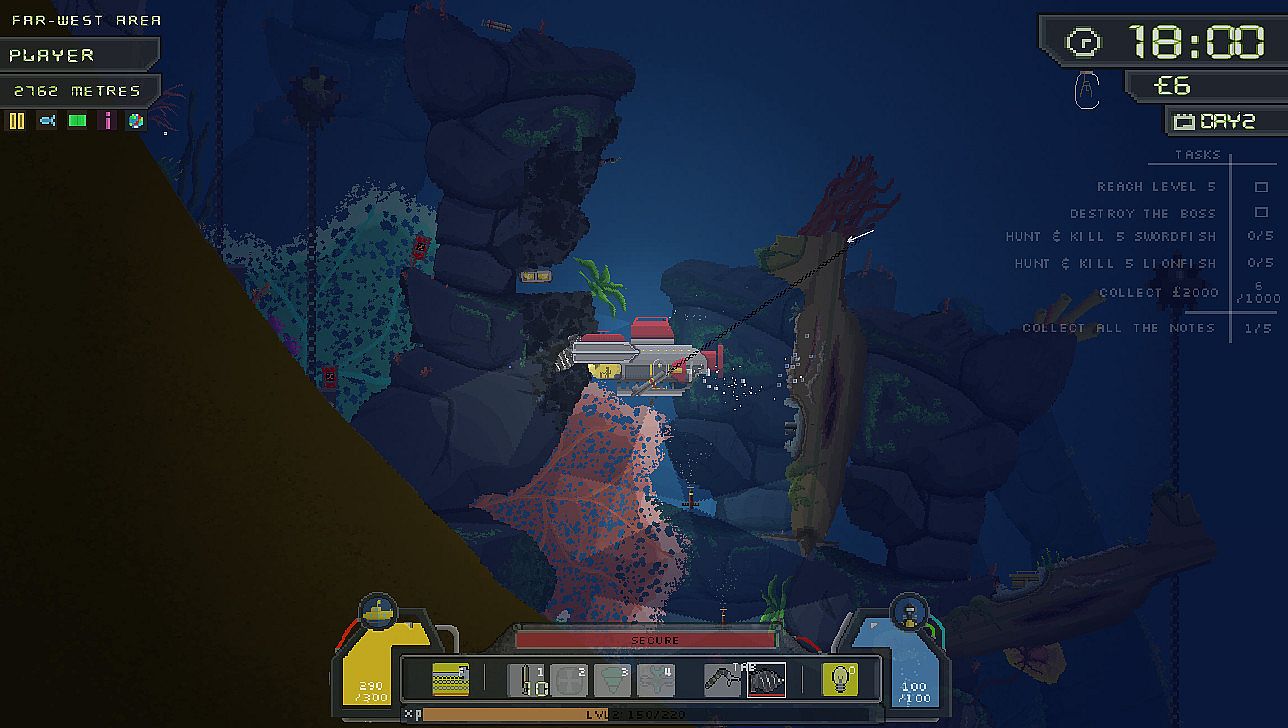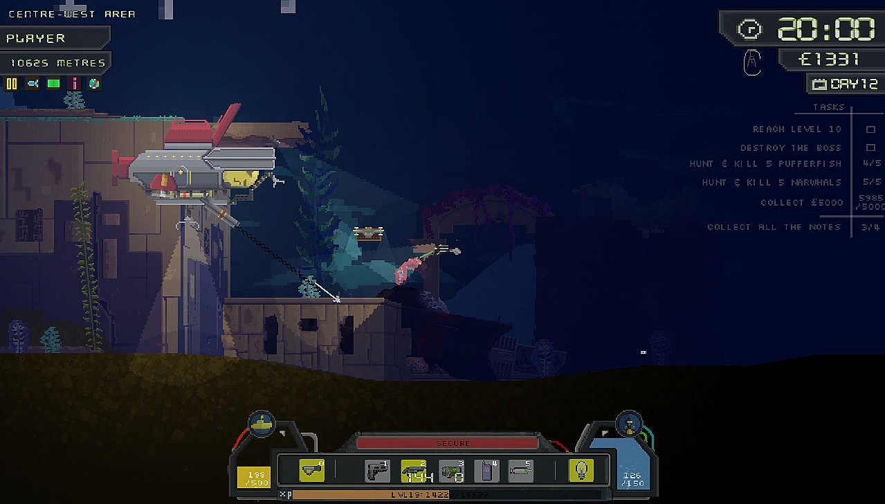 Utilise your equipment in a stylish blend of combat and beautiful aquatic moments, with a great original soundtrack and ambient sounds; we have created a living, breathing underwater world in pixel art graphics, with it's own day/night cycle. Much of the world is destructible, from blowing up wreckage doors with C4, to drilling and torpedoing your way through rock for fuel cells and chests.