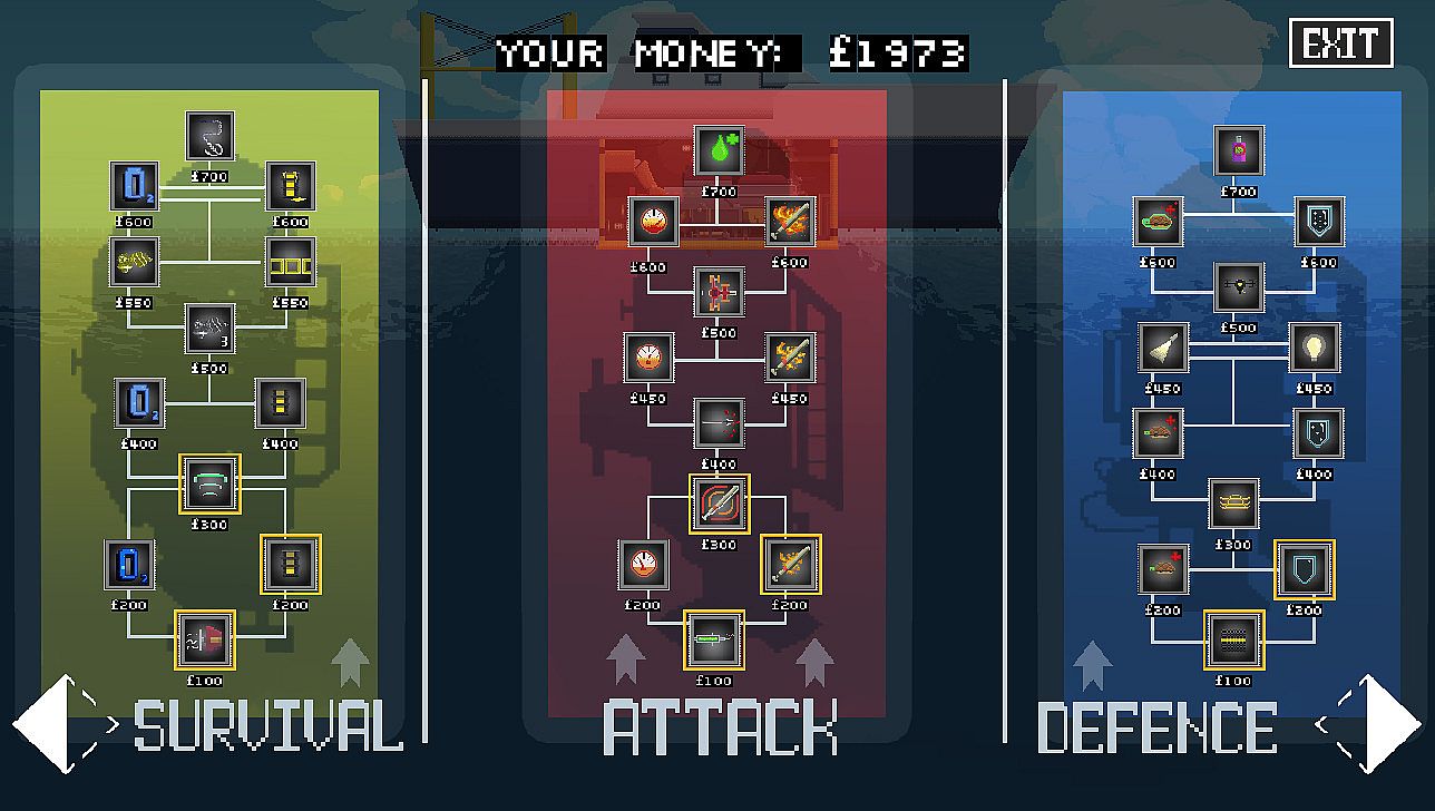 • Lots of equipment and upgrades to purchase along 3 tech-trees... Survival, Attack and Defence.
