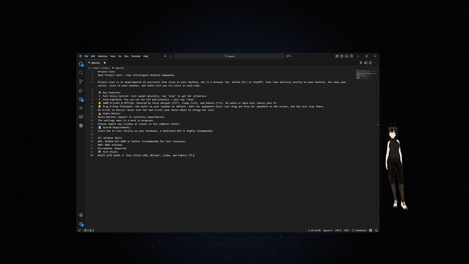 Project Alex is an experimental AI assistant that lives on your desktop, not in a browser tab. Unlike Siri or ChatGPT, Alex runs entirely locally on your machine. She sees your cursor, sits on your active windows, and talks with you via voice in real-time.