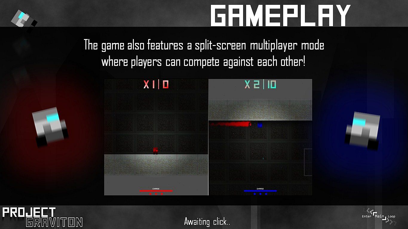 "Project Graviton" is a short platformer game in which users will control the character Bob, whom after stumbling into a secret section of his workplace, gains possession of a Gravity Suit and learns of its capabilities. The antagonist is Bob's Boss, the creator of the gravity suit, and he tries to prevent Bob from leaving the building with it. The level structure is based on 3 Acts, each containing 3 levels respectively. Players will attempt to reach the end of the levels, while avoiding a series of traps and hazards set by the Boss. Upon receiving the gravity suit, players may control their gravity to maneuver across various sections of the level. To balance the difficulty of the level, the game has a feature called "Memory point", that will allow players to respawn at a chosen point in the level, albeit in a limited number of times.The current version has a 30-60 minute (depending on skill) single-player experience to go through, 3 Acts (9 Total levels). A great story to unfold and challenging levels to come across!