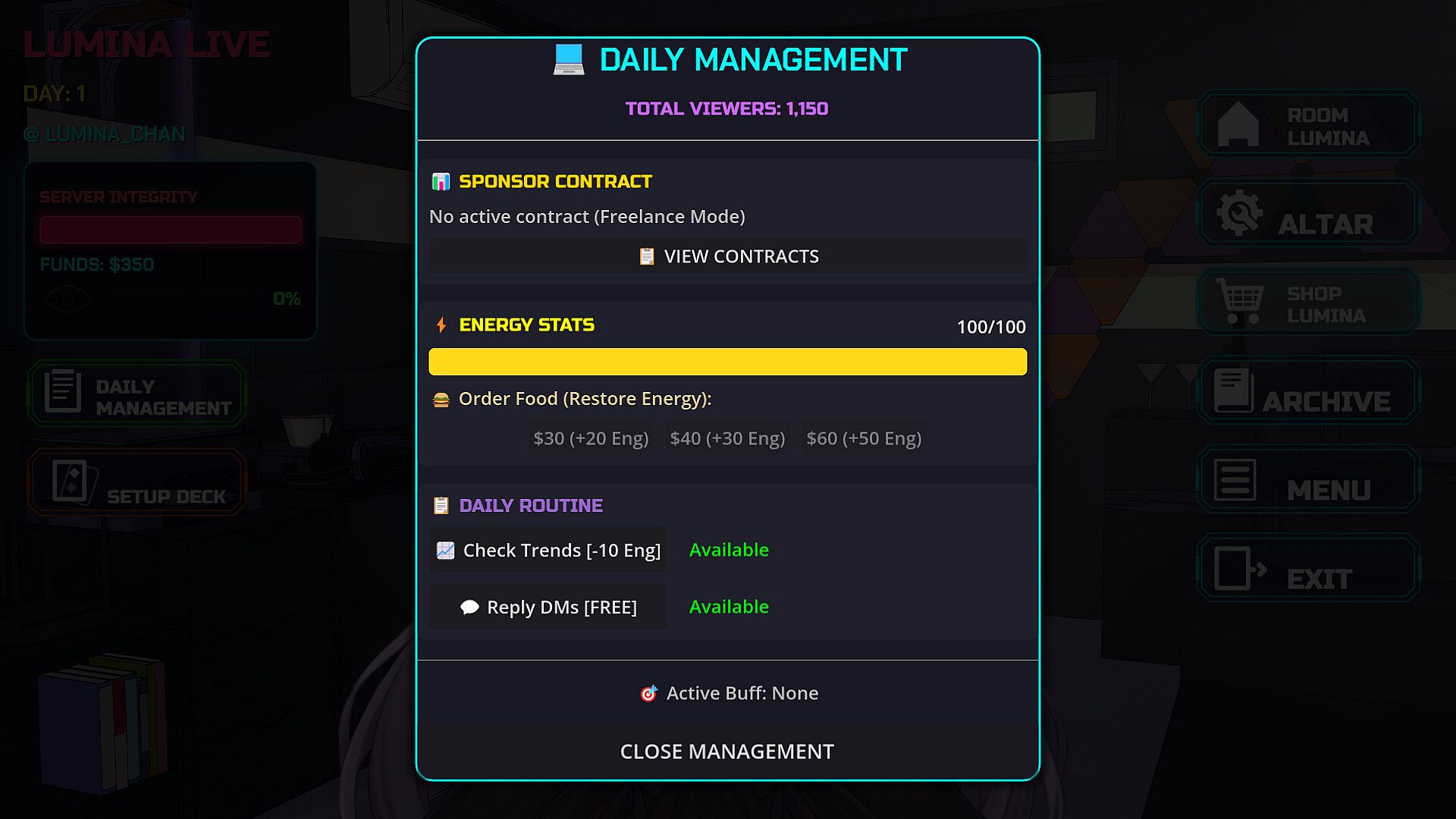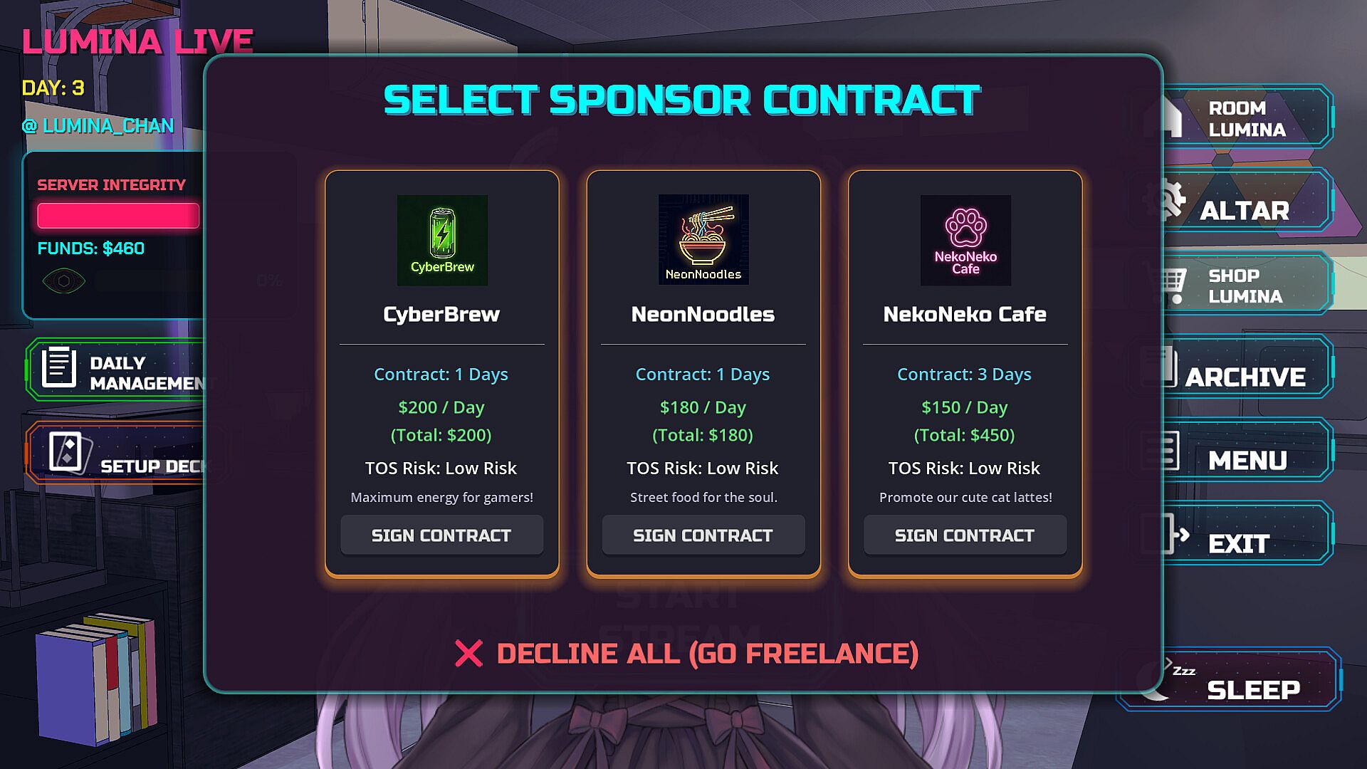 On-Cam (The Idol): Roleplay as sweet "Lil' Lumina." Livestream, crack jokes, do fan service, and keep that "internet's darling" image absolutely flawless to farm views and siphon as many donations as possible!