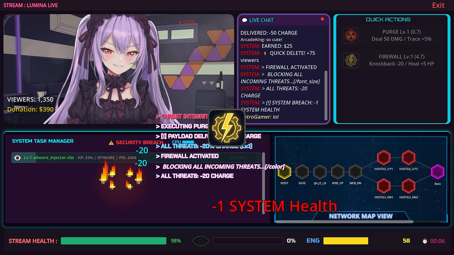 The livestream screen is your battlefield. While you're busy with fan service on cam, you gotta prepare to deal with real-time cyberattacks!