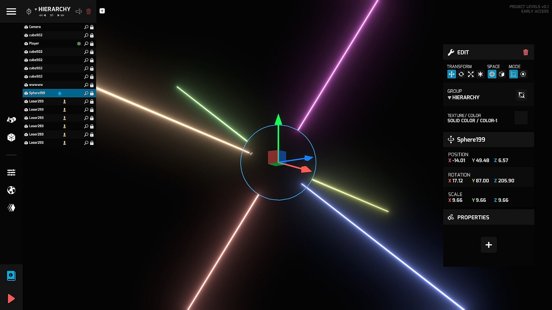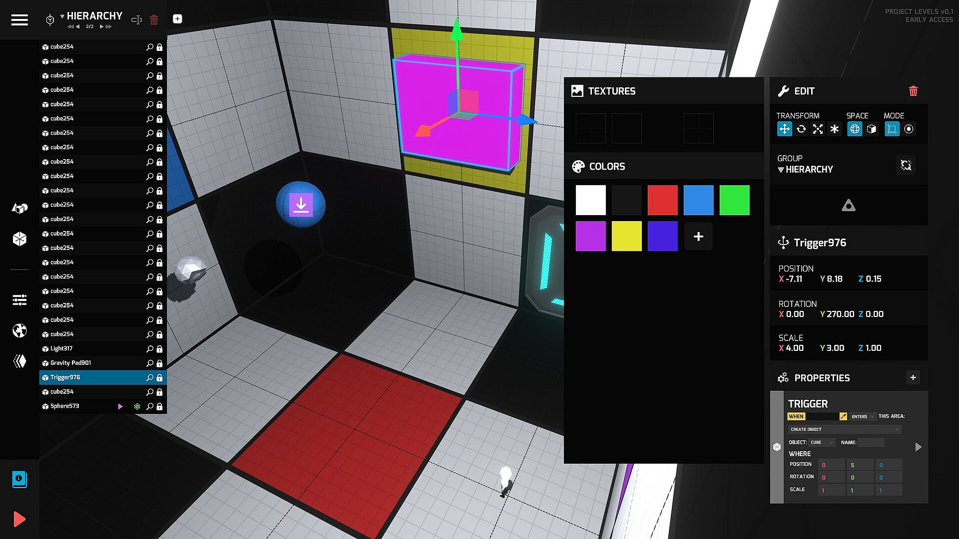 The in-game editor used in PROJECT LEVELS was designed by sticking to the most common conventions in the game development industry. Transform modes, hierarchy-based structure, materials... every detail is directly inspired by the most used softwares out there to help people learn the principles of game development.