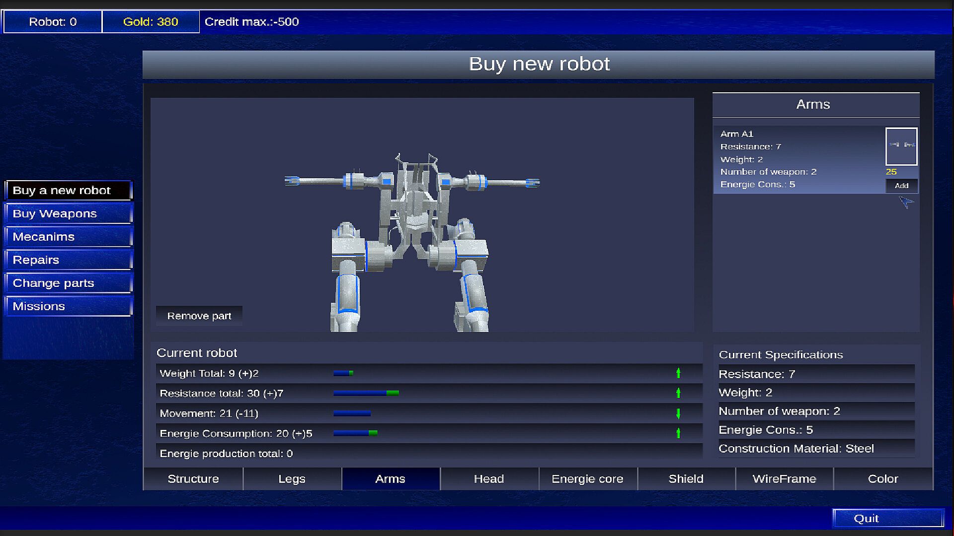 Build, fight, and destroy enemy robots in this free demo game. Command a squad of customizable robots, modifying their arms, legs, core, and more. In this turn-based game, you'll need to evade enemy attacks and strike back strategically. Everything is limited : your ammo, your movement, your shield, your repair kits... use them wisely!