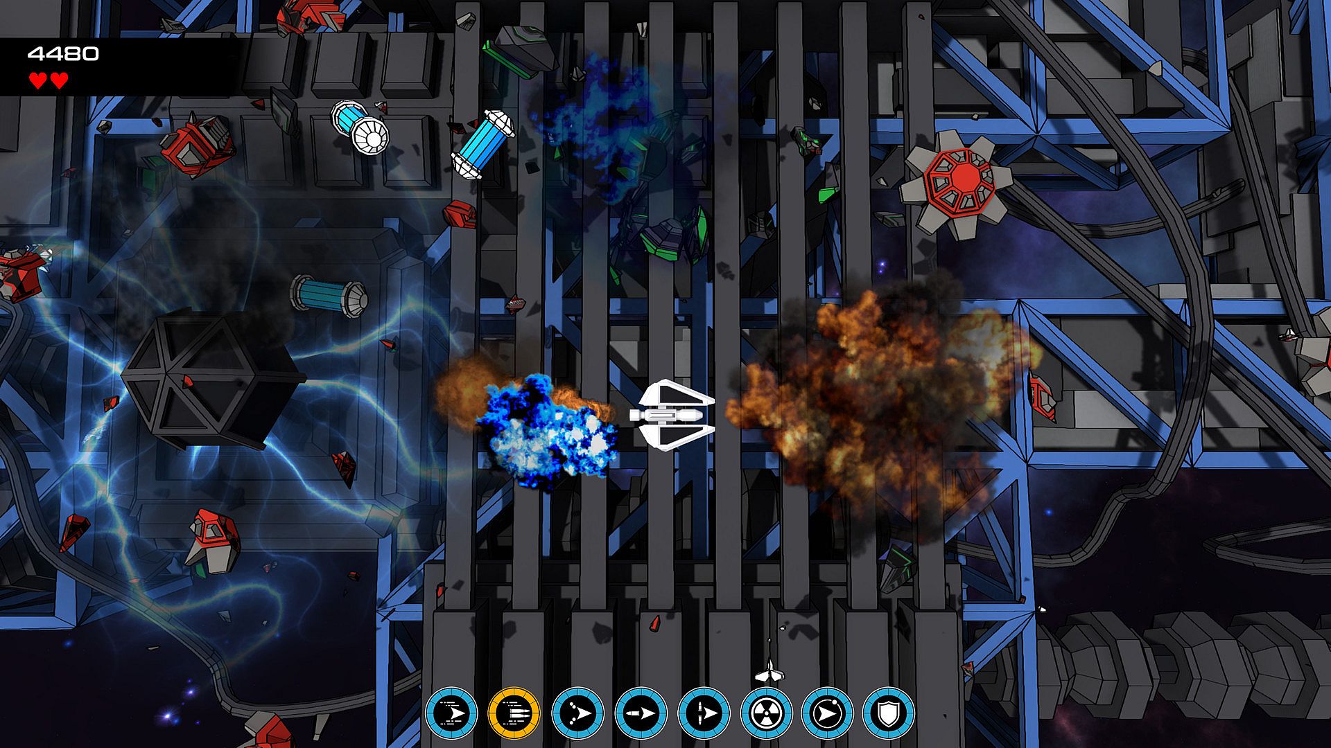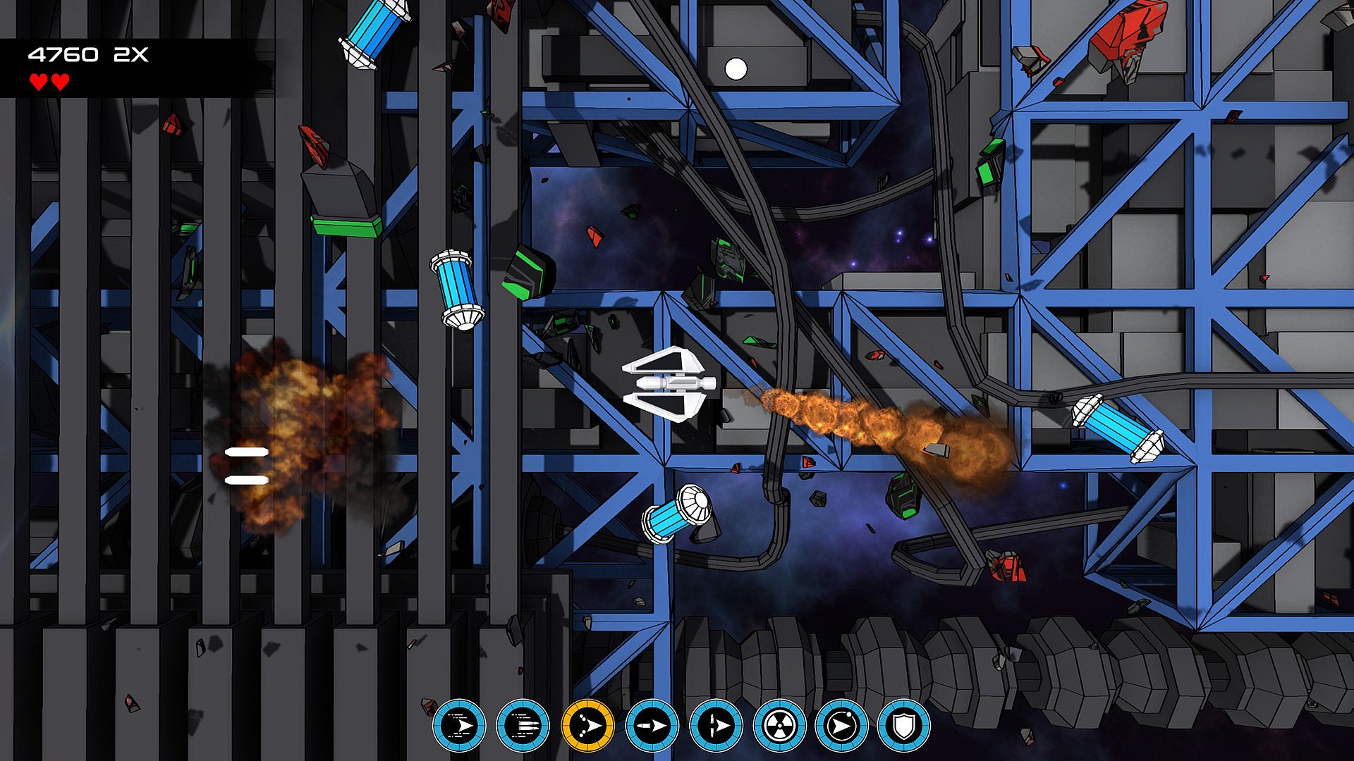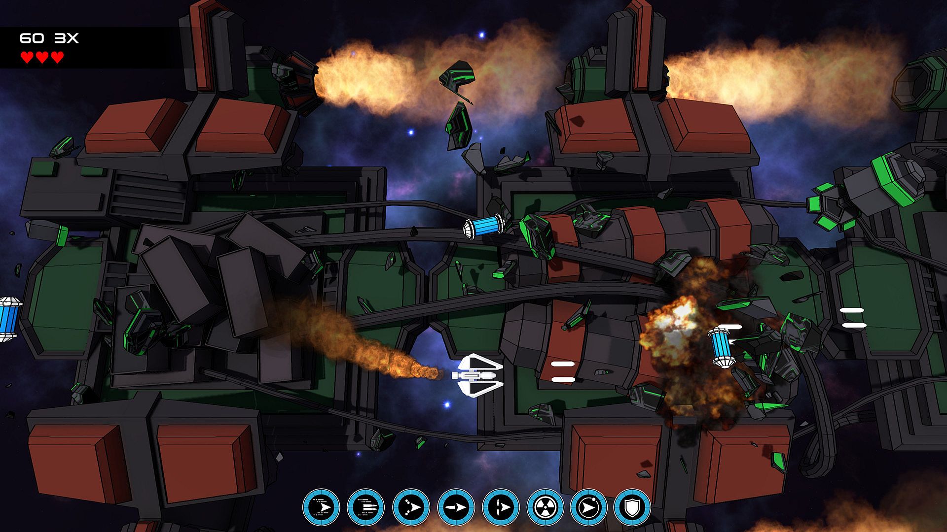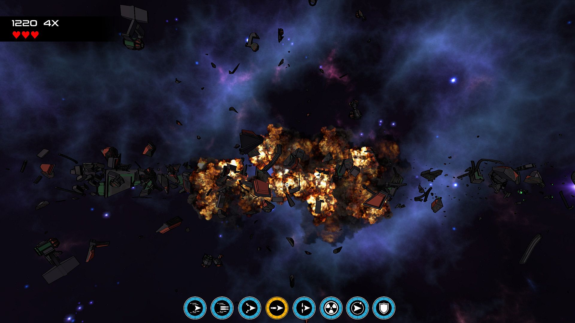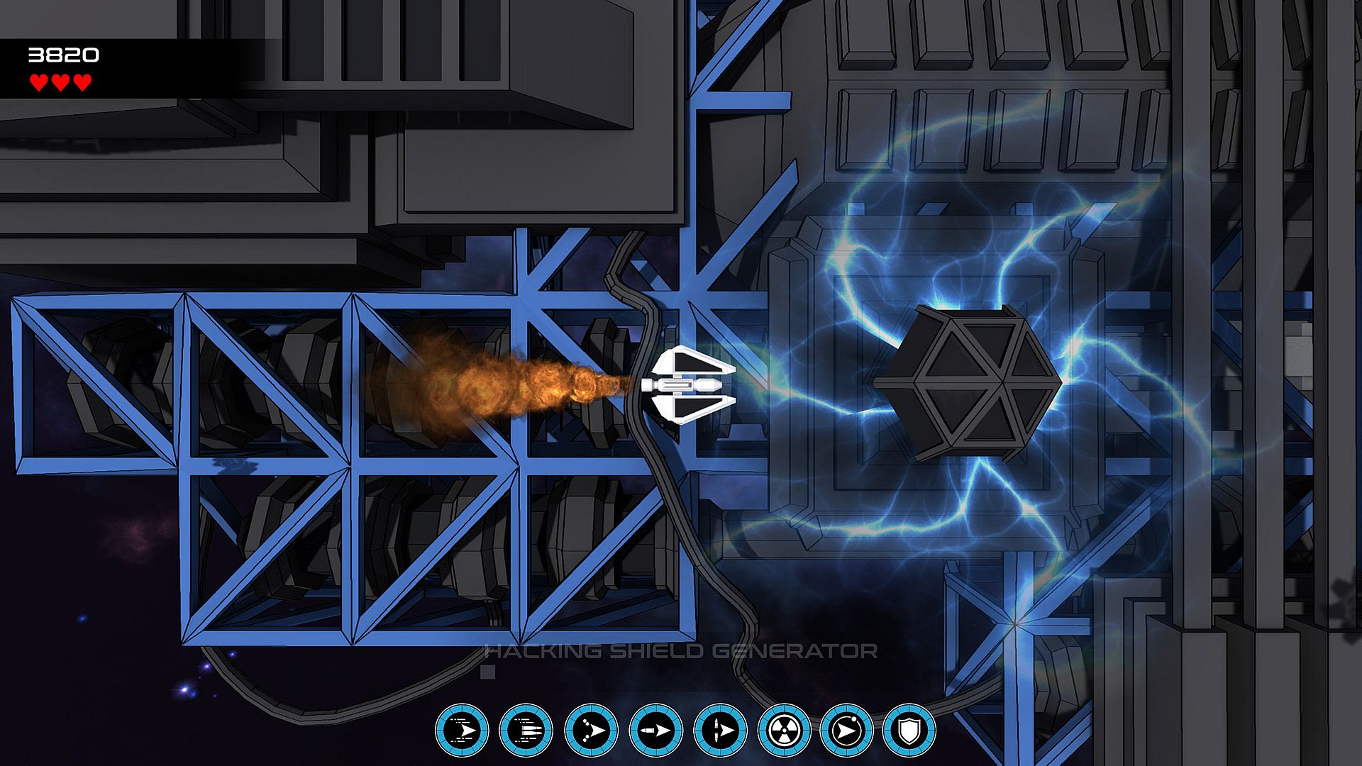 Fly left and right over the Promethium armada ships. They have shield generators protecting them. Hover over a shield generator to hack and disable it. Once all the shield generators are disabled a self destruct code will be sent to the armada ship causing it to explode. Be careful though, the armada ships are guarded by a fleet of fighters!