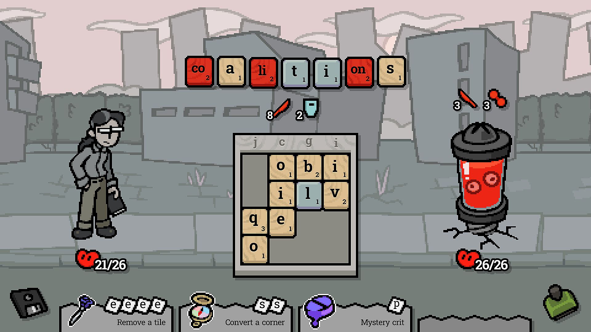Retransition as different characters in the face of an oppressive bureaucratic collectivist state. Take advantage of their unique abilities to hole punch tiles and submit multiple words at once, weave through fish to catch specific letters, or juggle ticking bombs against a racing clock!