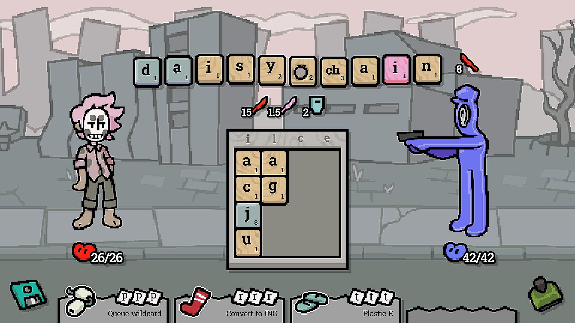 Strategize your spelling; use wooden tiles to attack and plastic tiles to defend. Activate spells to manipulate tiles to your favor—shift letters across the alphabet, turn tiles into candy, and watch words spell themselves with wildcards.