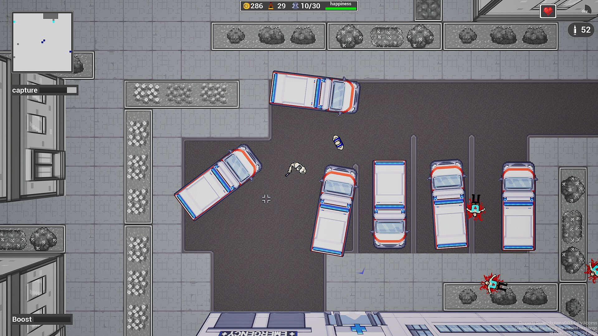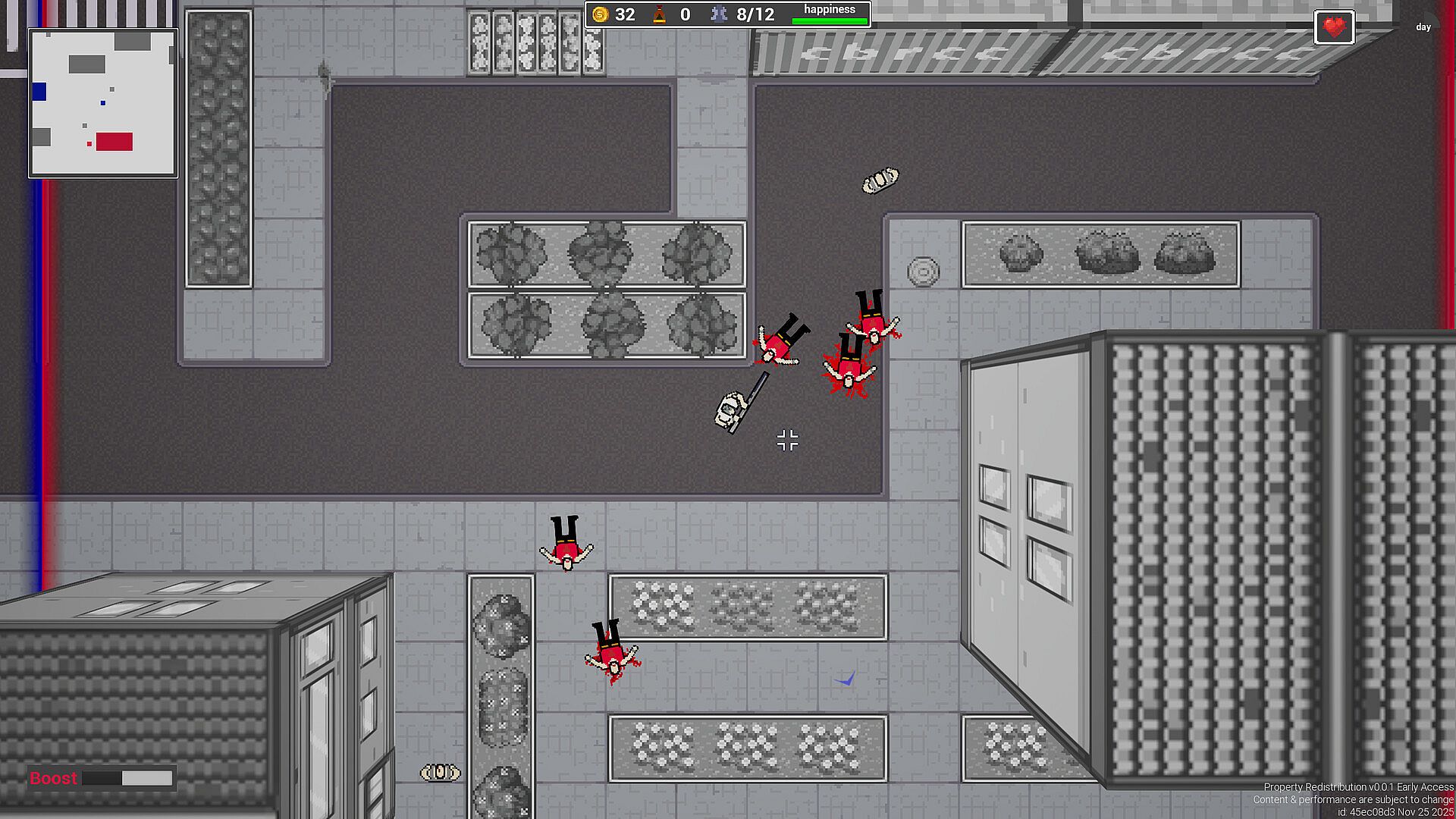 Property Redistribution is a hybrid of top-down 2D action and resource management strategy. Play the role of a gang leader who must both plan and fight enemy forces. Remember, a leader is nothing without his followers. Your gang will help you succeed in a harsh world where almost every hit or shot ends in death.