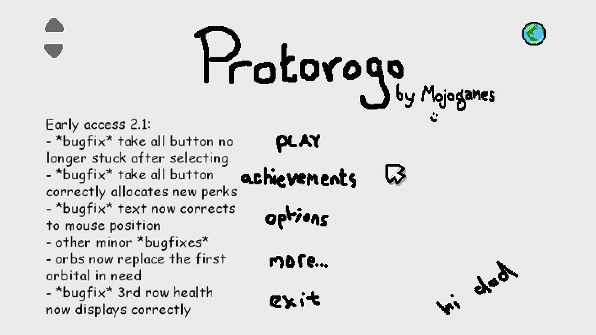 Protorogo is an idle roguelite with a focus on ability synergies and strategy for defeating progressively more difficult enemies. You play as an immobile white circle, obtaining parts and abilities from the store to defend against the waves of red enemies. Complete achievements and unlock extras! Gameplay is intended to be accessible to most platforms with easy, simple mouse/touch controls. Most of your interaction will be selecting options from the shop to most effectively build your strategy for defense. Your skill level will lie in your strategy and luck.