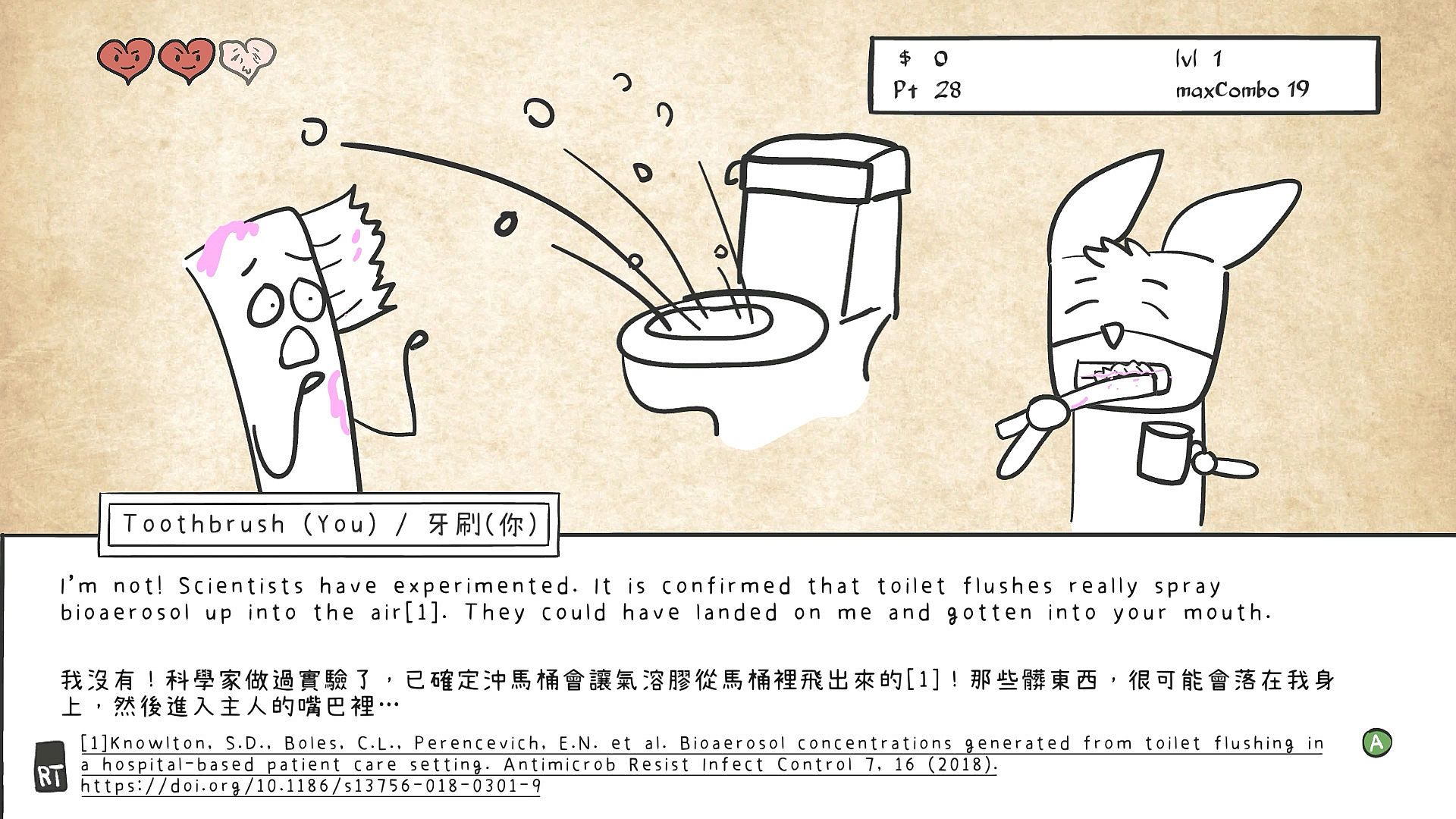 In the bathroom you reside in, your toilet lid is broken. Every toilet flush is splashing aerosols all over the place. You, as a toothbrush, must eradicate the threat and protect your master. Along the way, you'll upgrade your gear, meet new buddies and learn the absurd world through your master's story.
