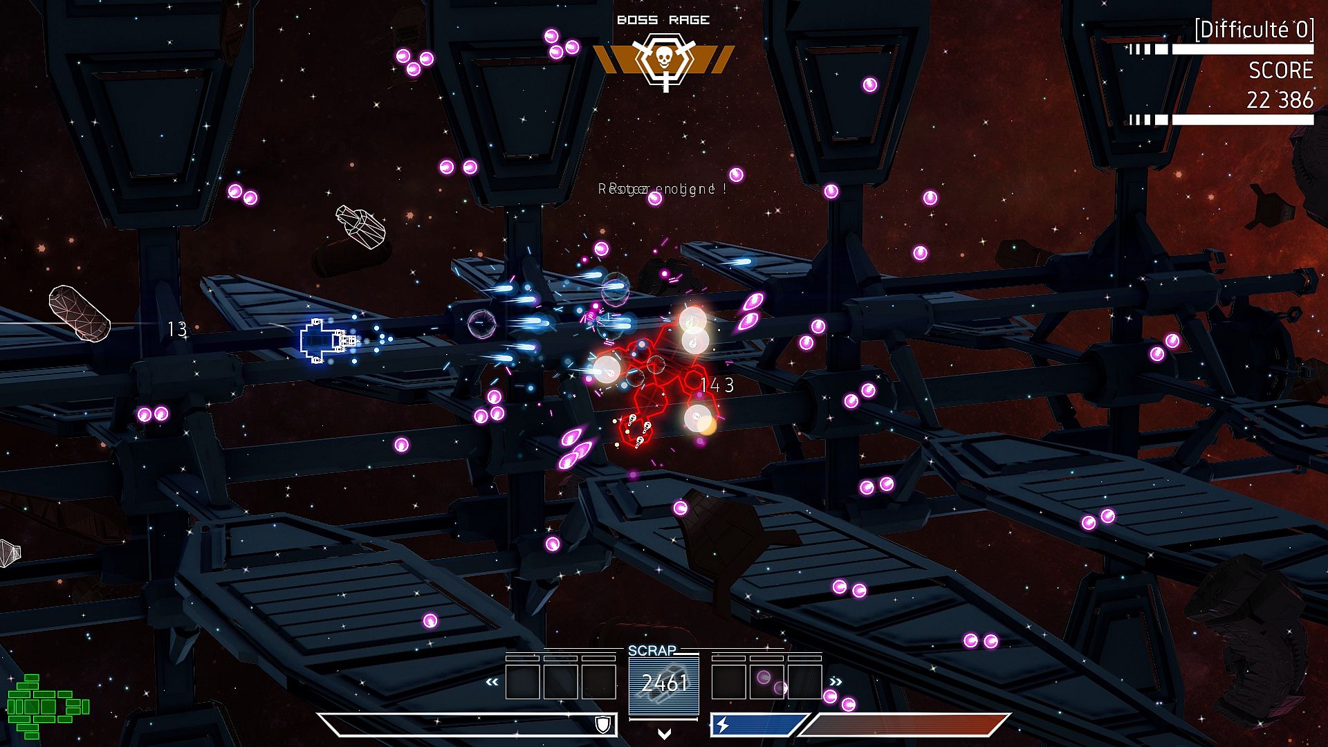 You play RSR-648b, a psychotic warship A.I., who wakes up somewhere in space after a very long hibernation. It needs to rebuild itself and will recycle anything it finds in order to return back to central command. In its madness, every unidentified moving object becomes a potential threat that must be crushed. Can you shoot and loot your way through alien territory and back to Earth ?