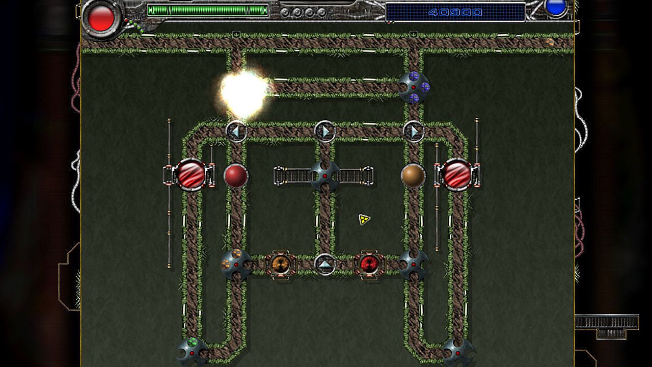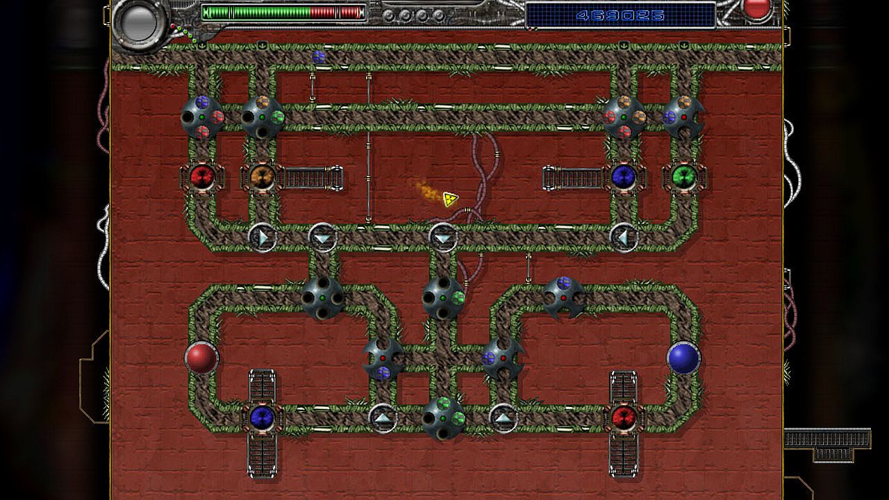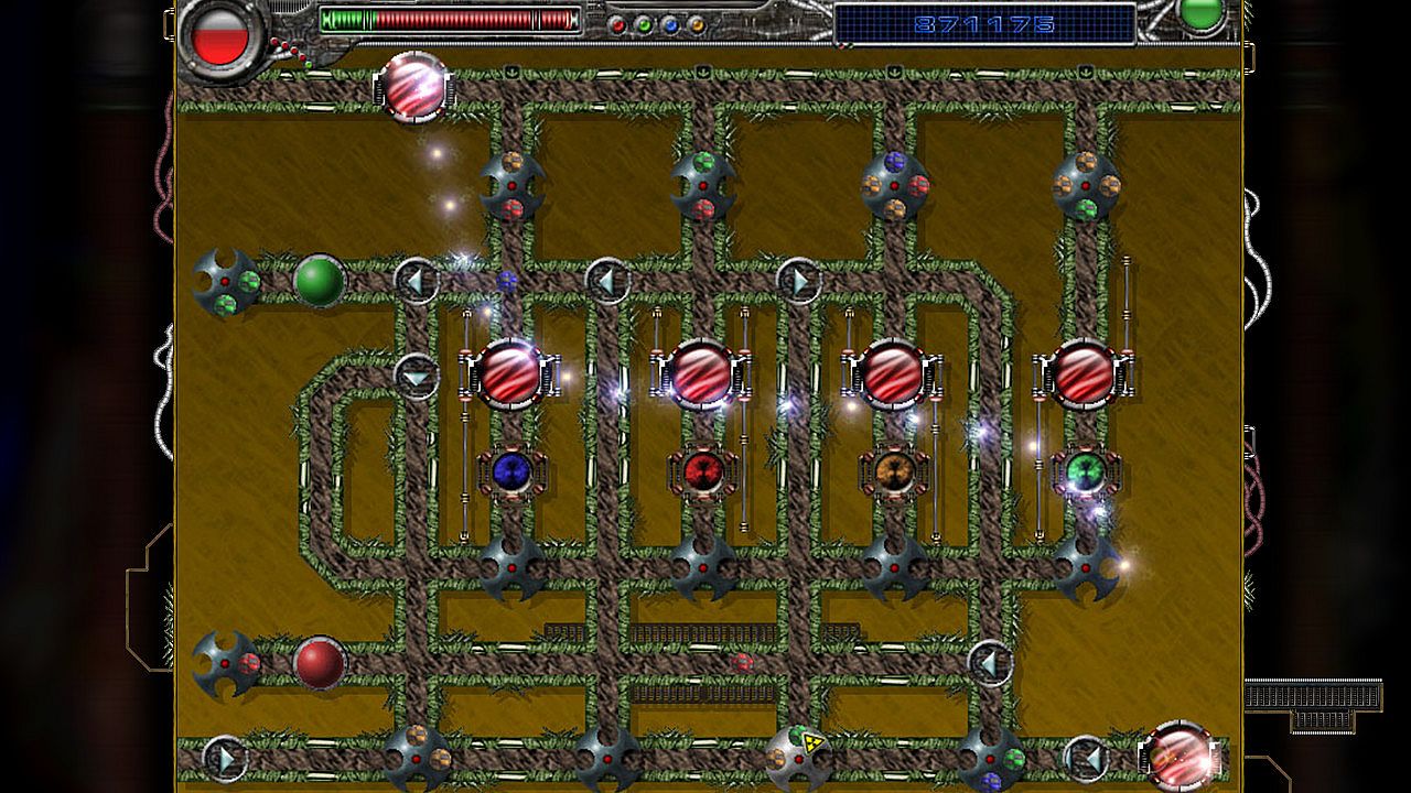 Psychoballs is a single player puzzle game, where you try to eliminate all the spinners on the board by making them contain four balls of the same color at once. Balls travel down given paths around the board, and get caught by a spinner if an available slot is facing them. Spinners are the only parts in the game that can be controlled directly by the player. Players can rotate the spinners clockwise, and can release any of the captured balls into the pipes to move them to other spinners. The goal of the game is to move the different colored balls between the spinners in order to get four balls of the same color in any specific spinner. This straightforward task becomes more and more challenging with the addition of new gameplay elements over the course of the game.