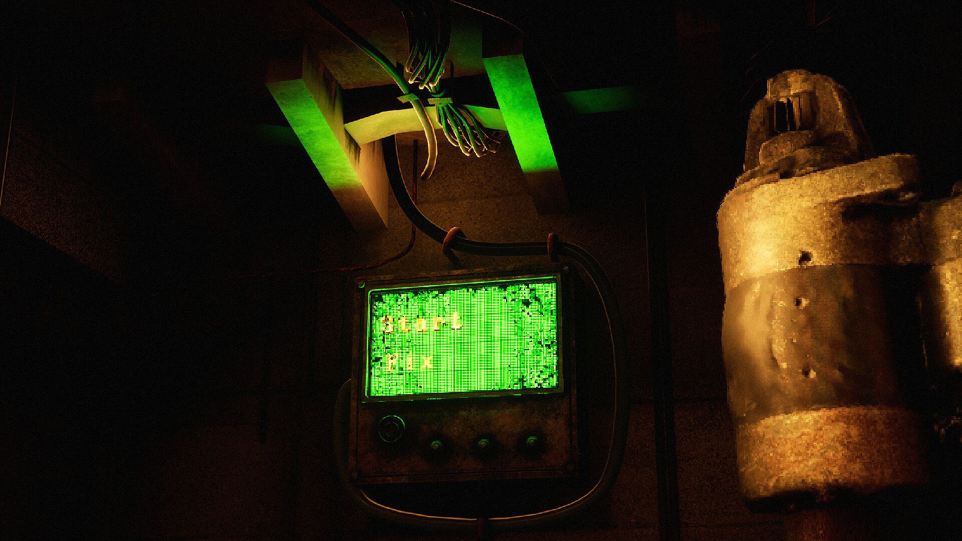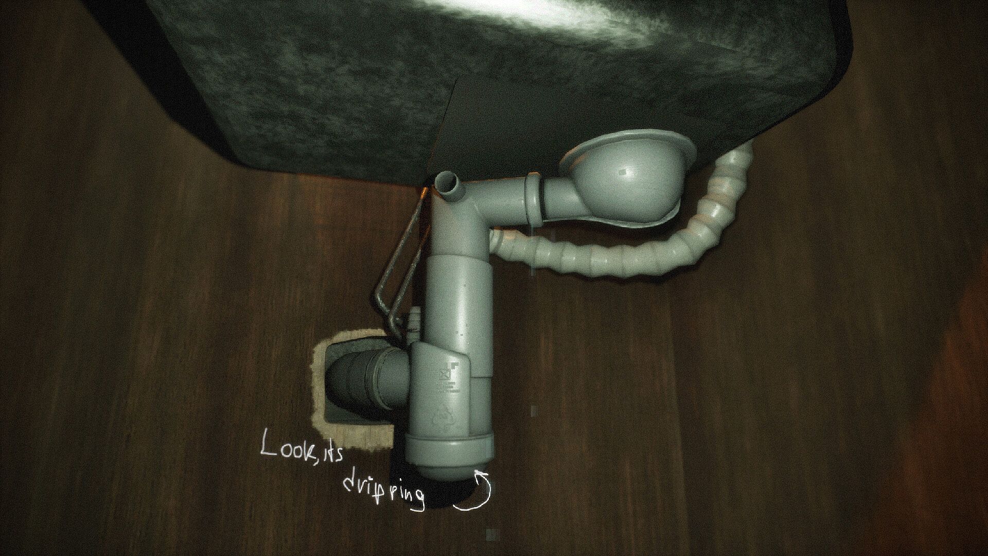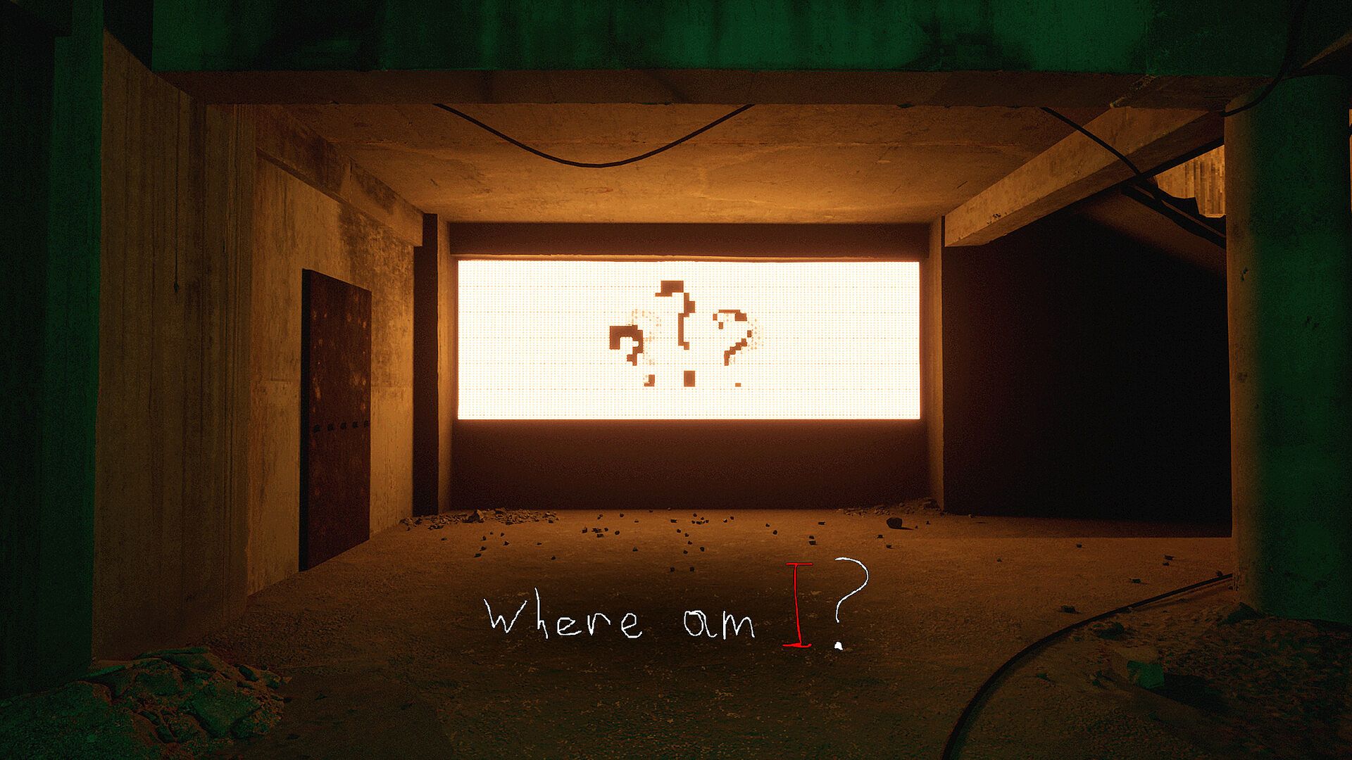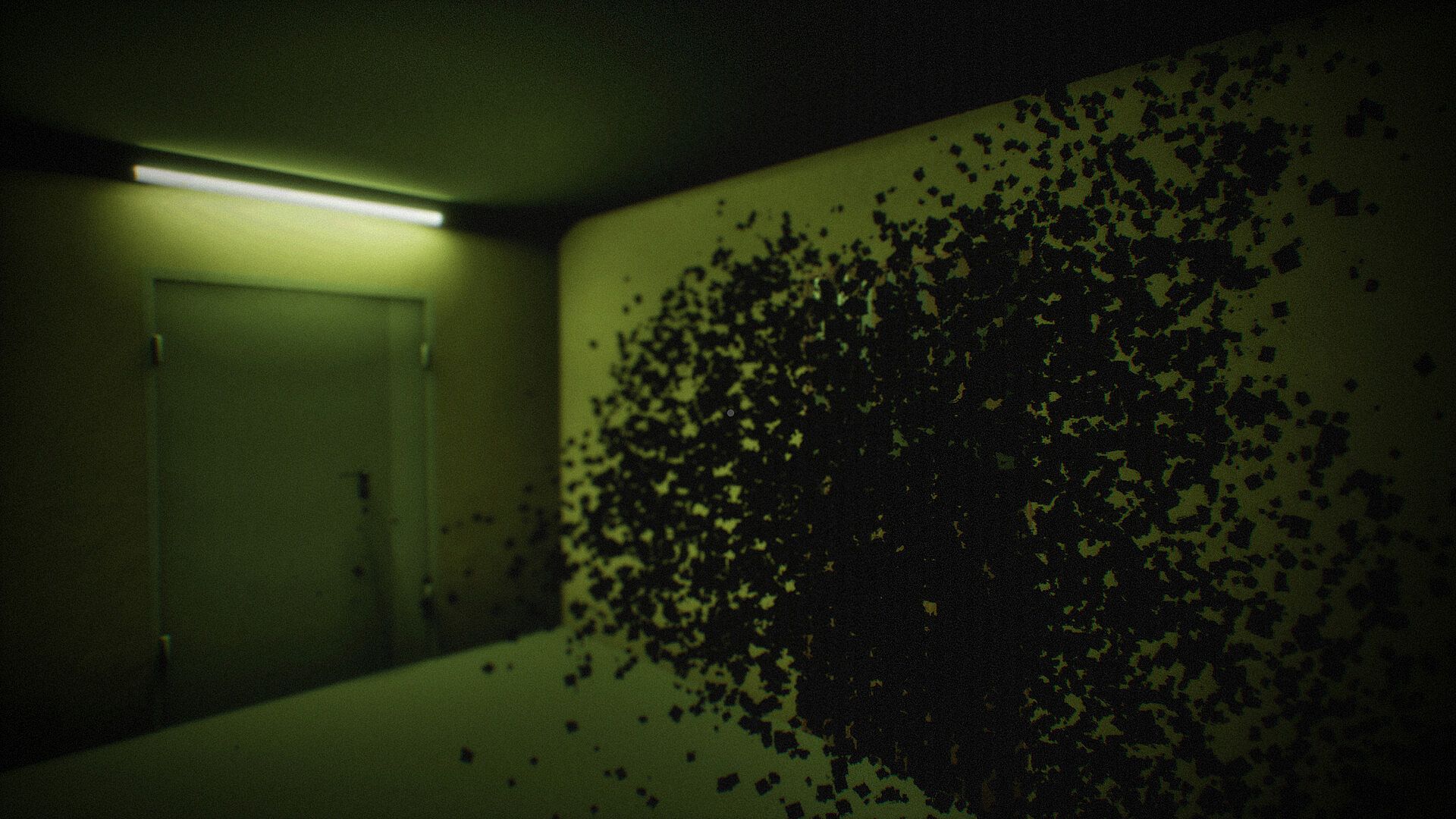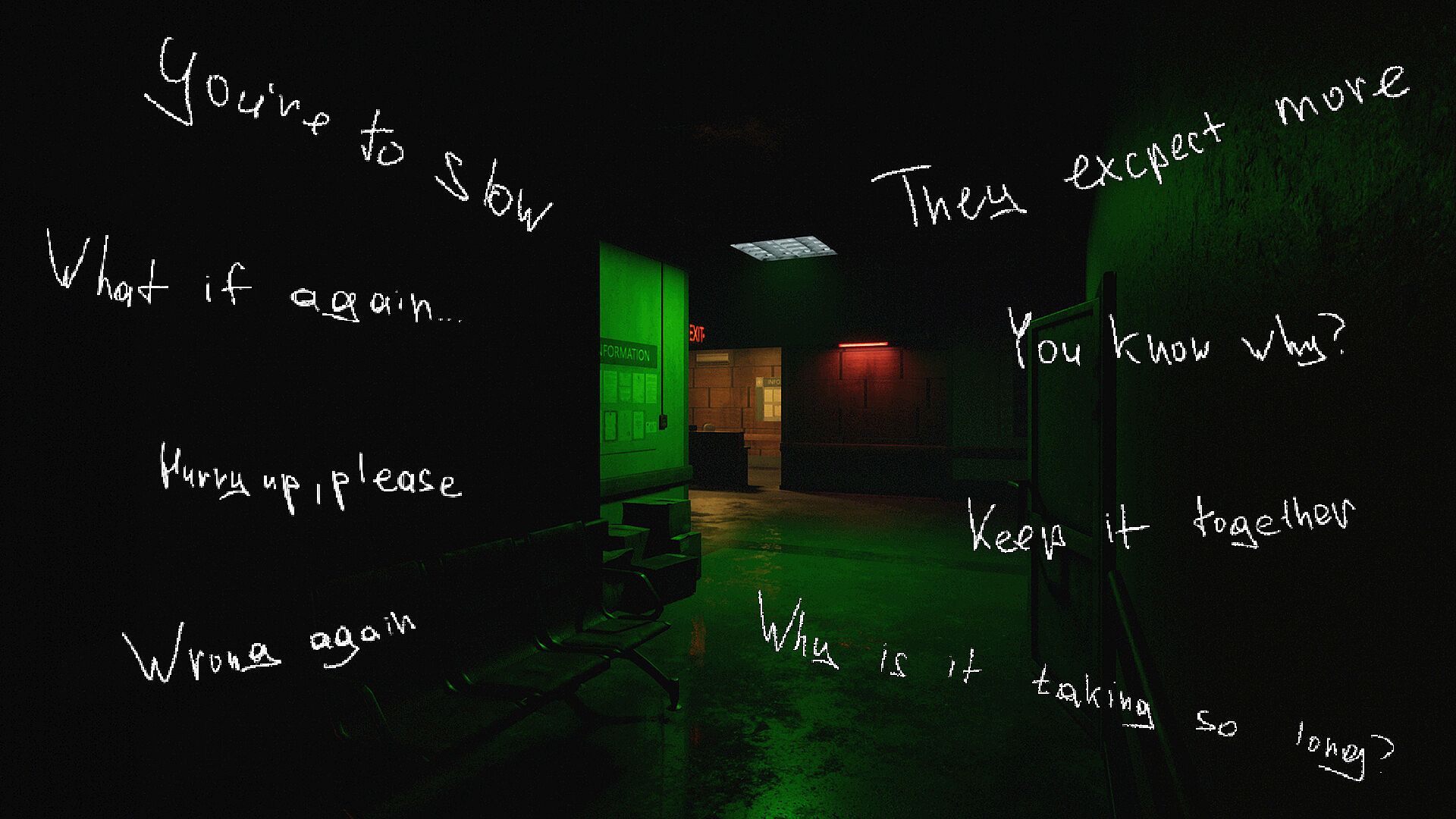 Intrusive thoughts mechanic — disturbing phrases appear on screen instead of the protagonist’s voice.