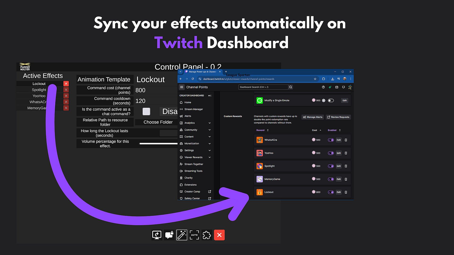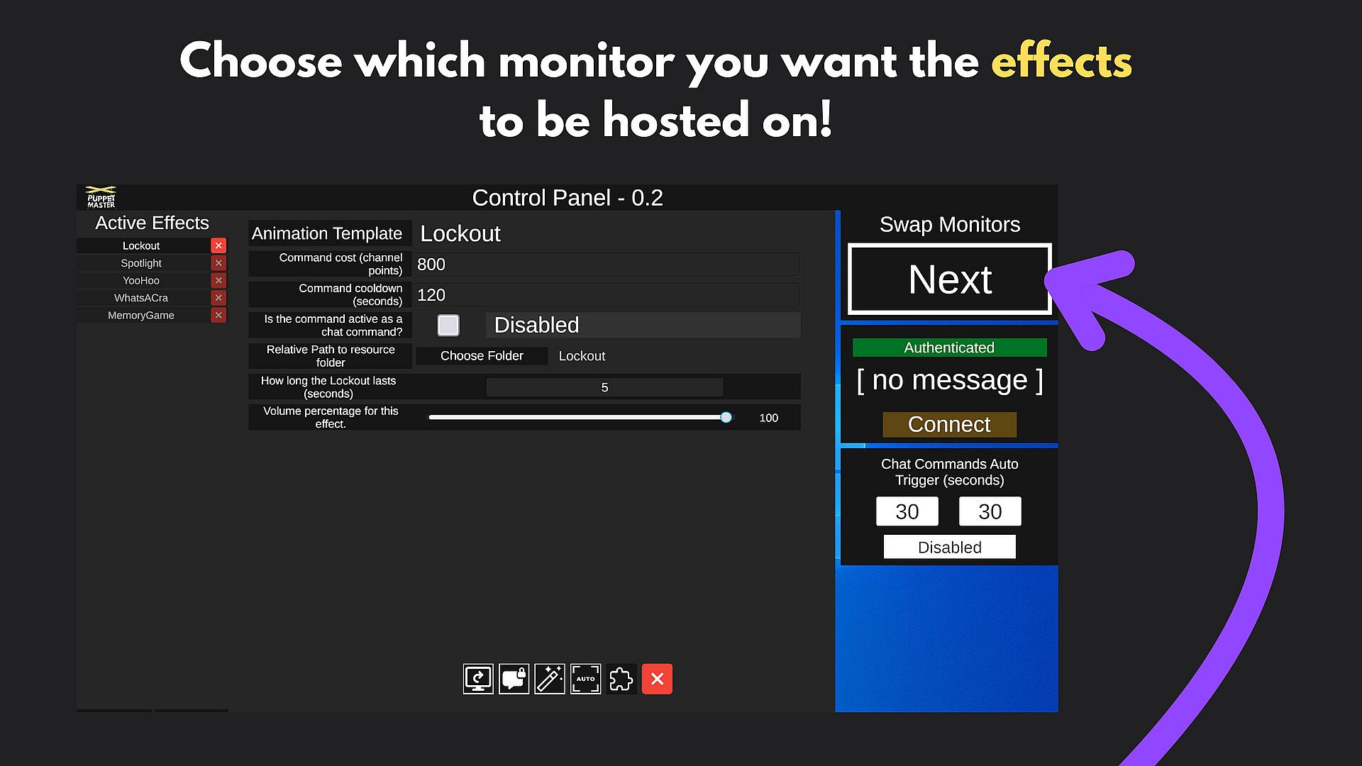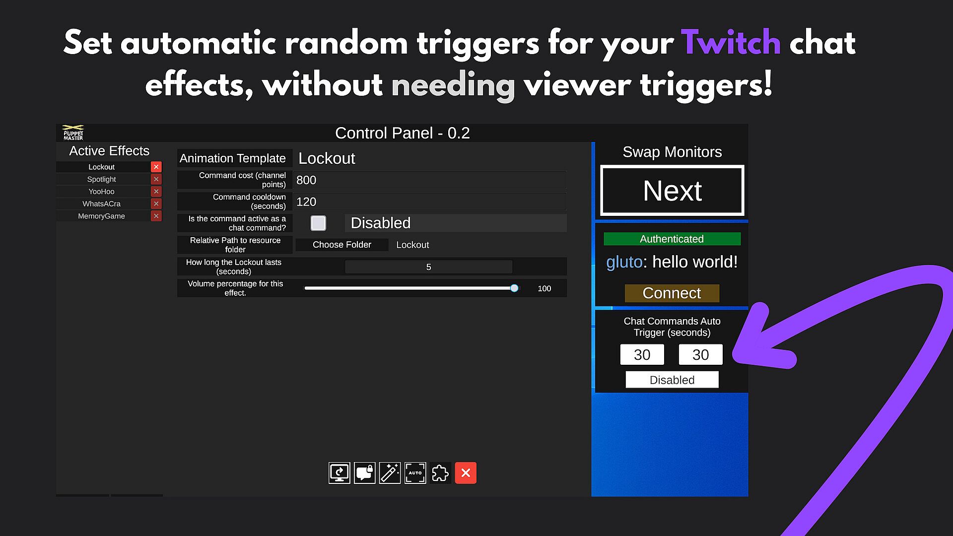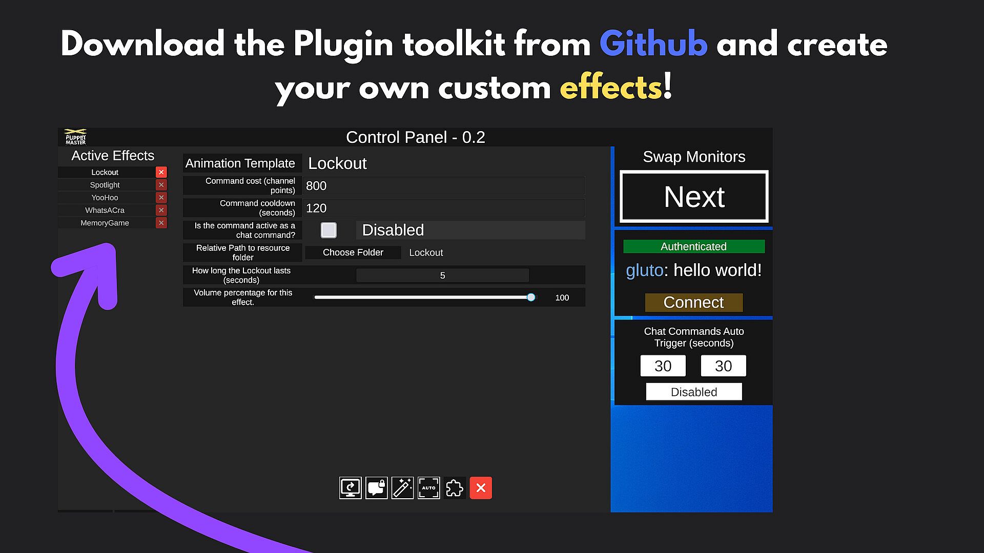 PuppetMaster is a Twitch streaming tool meant to be downloaded and ran on the streaming machine, where Twitch Chatters can trigger effects directly on the Streamers machine for hilarious results!