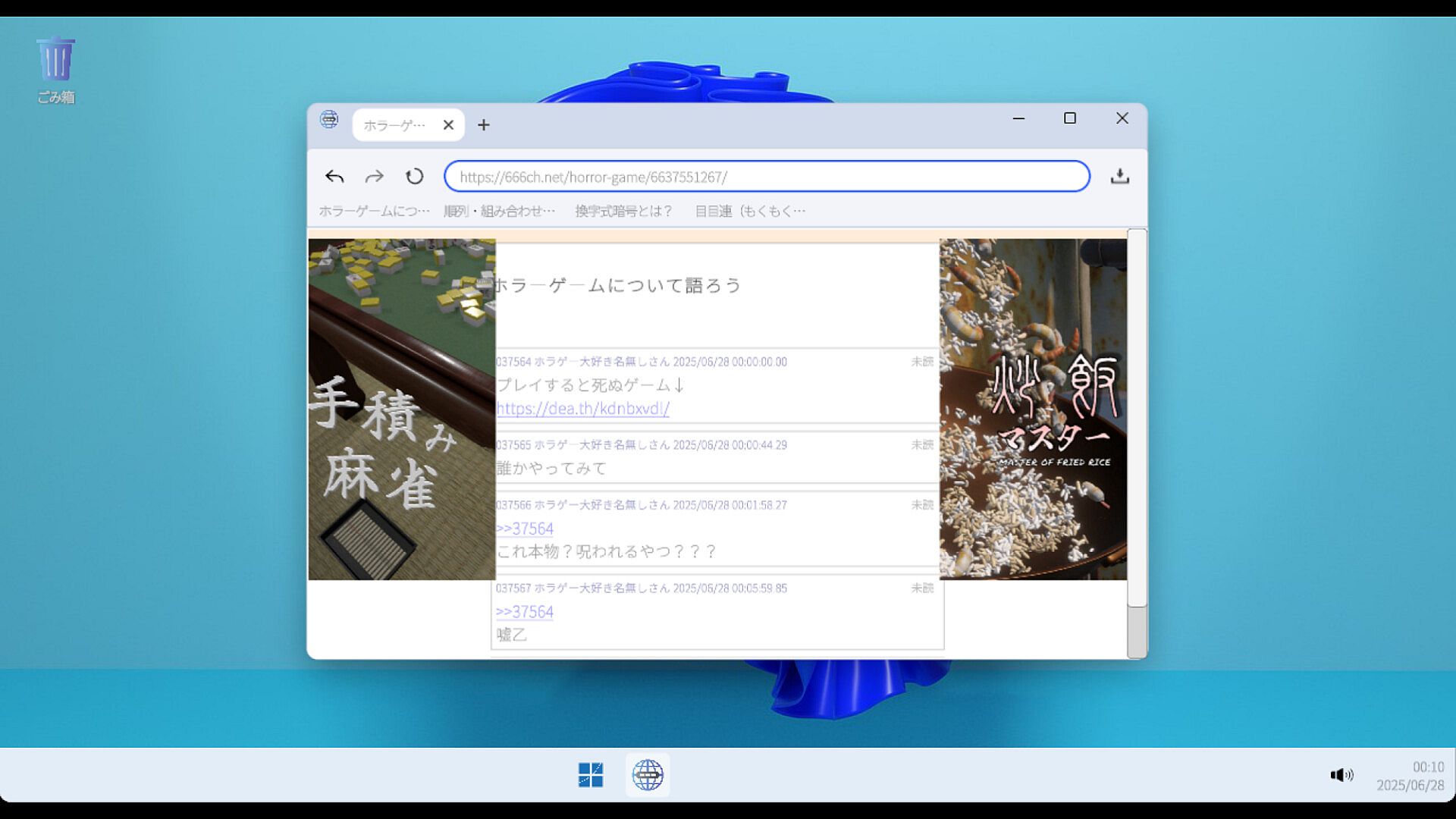 This is the desktop horror adventure game. The virtual desktop contains a game, a browser, and several applications. You will seek ways to avoid death by using not only the game but also various information displayed on your desktop and browser.