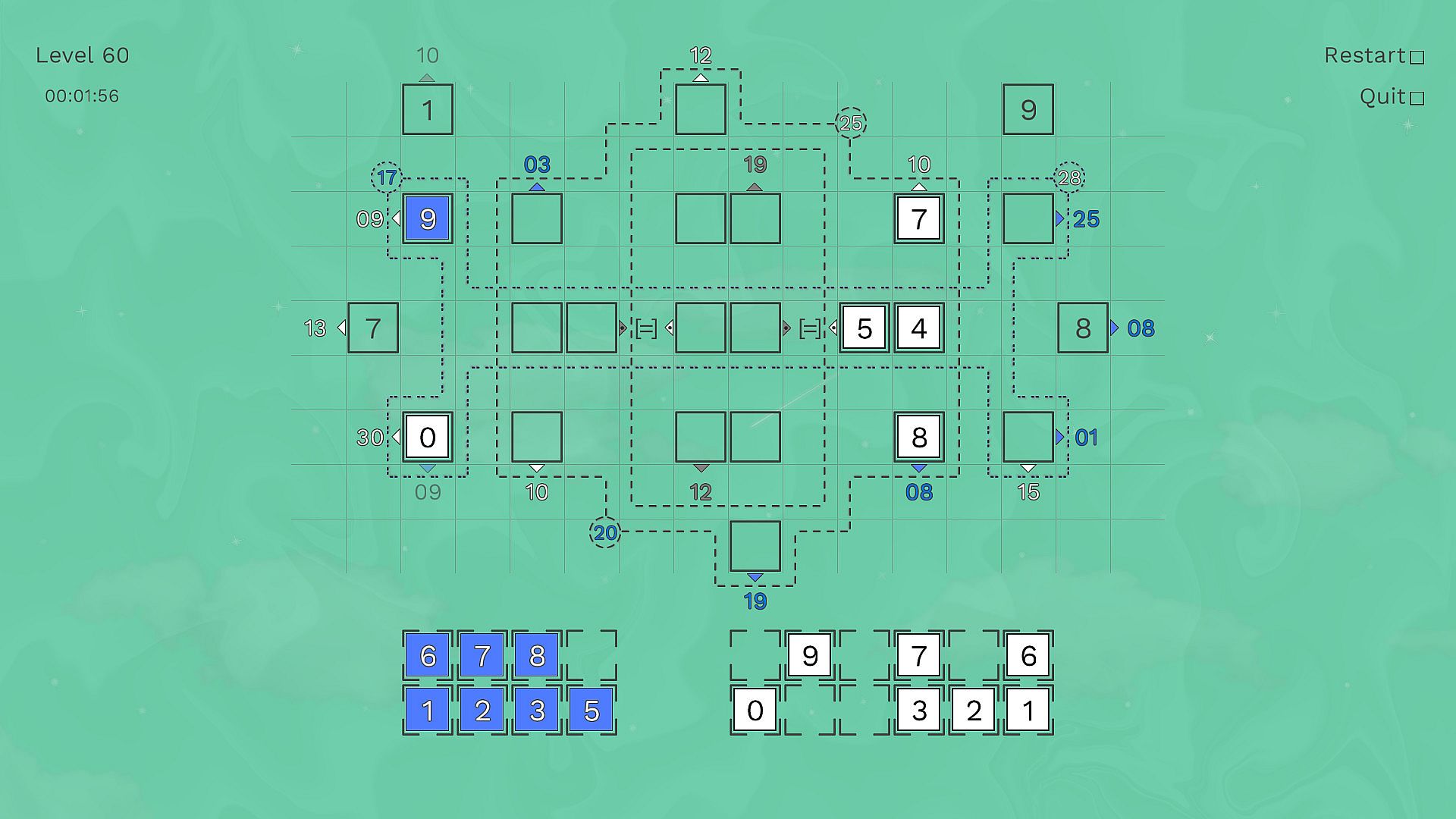 Unique logic puzzles draw from sudoku and kakuro rules in this indie casual game. Players drag numbers from the bottom row to empty spaces above, adhering to the given guidelines. Notation marks free spots for easy tracking. Simple drag-and-drop controls pair with 64 handcrafted puzzles that ramp up in challenge. Ambient sounds, background effects, and peaceful music create a calm vibe. Casual players who enjoy methodical brain teasers find a perfect fit here, complete with Steam achievements.