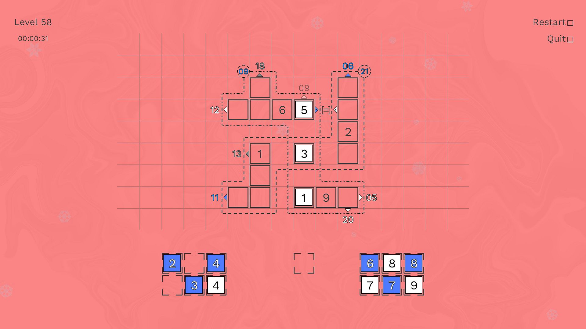 To complete puzzles you must drag the available numbers on the bottom to the free spaces above, following the provided rules.