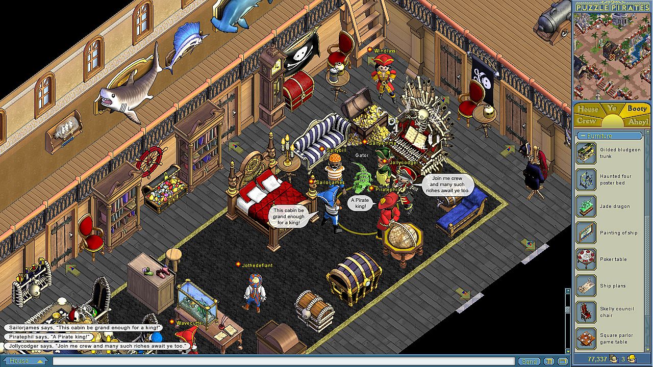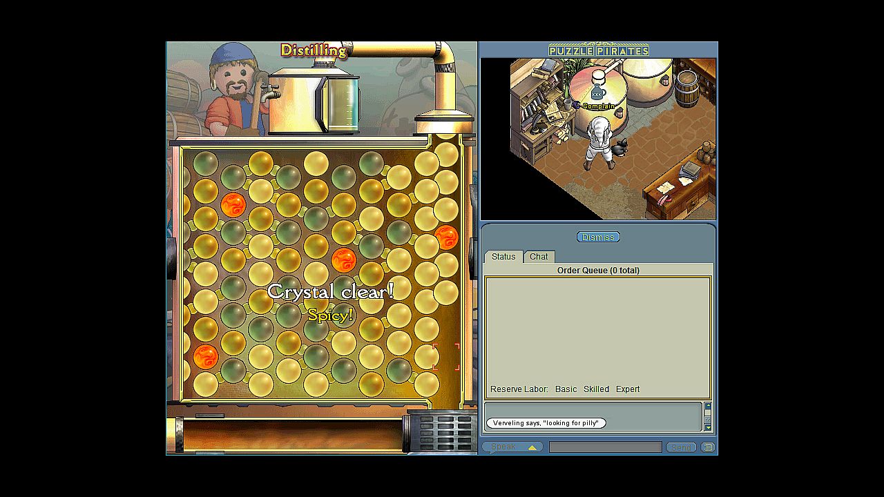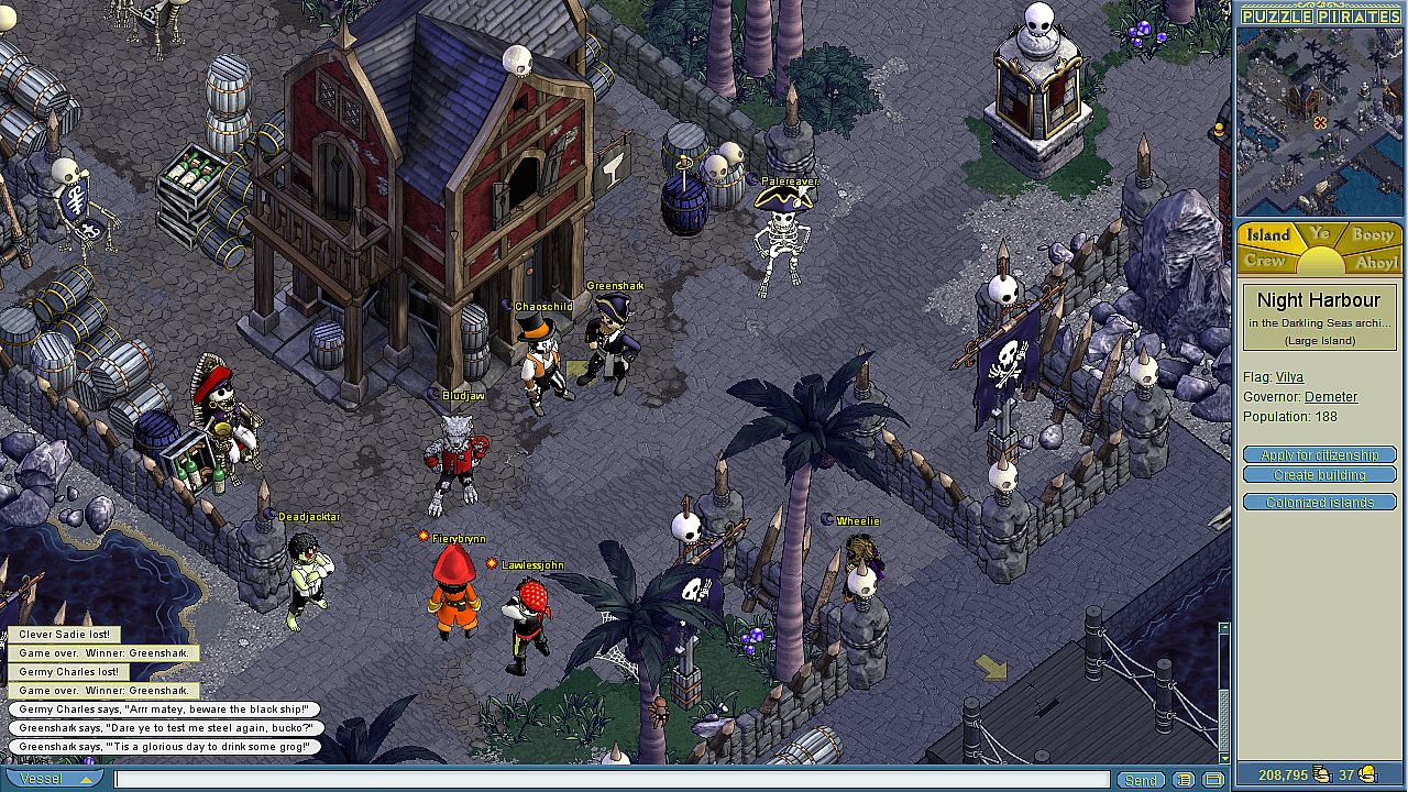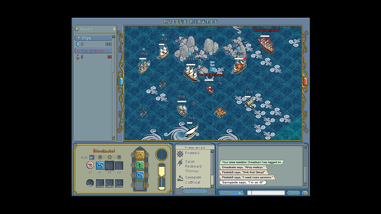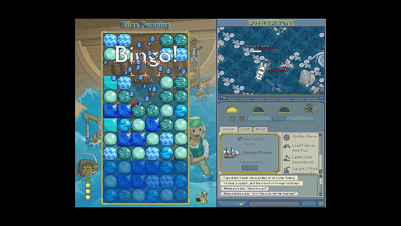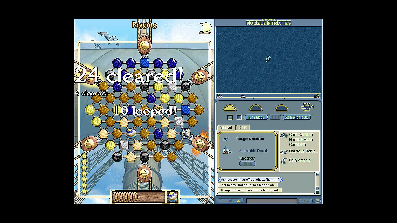 Brace yourself for swashbuckling puzzle action as you pillage your way to glory across the briny deep! Create and customize a pirate, collect booty, and join a player-run crew of cutthroats! Every activity in Puzzle Pirates is a uniquely fun puzzle: be it sailing, gunning, or hauling treasure, your own puzzling skill determines your success!