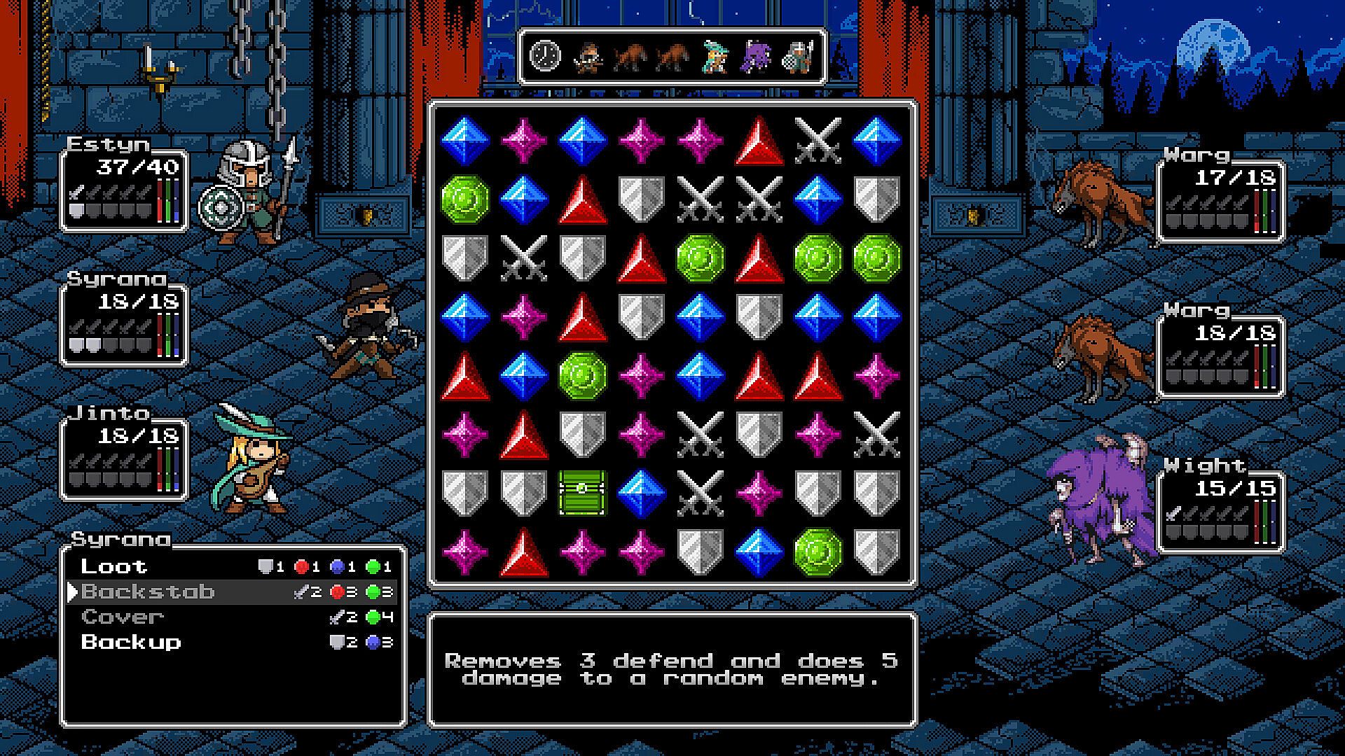 Guide your party through the forbidden castle, gathering equipment and items to bolster their strength! Encounter enemies and battle them in 16-bit JRPG style combat, but with gems! Gain levels and have your party members learn new abilities! Make choices that create useful synergies! Choose your path through written events with outcomes that affect your party! Get handy pro-tips from the in-game manual!