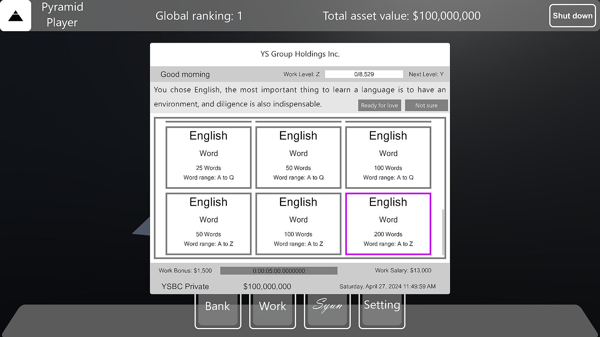 When you enter the game, you will be given a corresponding bank account that will immediately arrive with a sum of money, which will be your initial funds. The bank account will be determined by the level of bank you purchase, with the game itself plus the 5 DLCs totaling 6 different levels of bank accounts, and the initial amount of money arriving being the minimum daily closing balance for that level of bank account. Please note that purchasing the DLC does not add wealth to your existing assets, the 6 bank levels generate 6 separate game archives. Because we are not looking for players to increase their wealth in the game by purchasing the DLC, but rather these 6 initial funds symbolize 6 different classes of birth, we want players to experience if the different classes of birth will affect where they end up. Some of our DLC is very expensive, even though we know that players are fully capable of buying it, but we do not want players to buy it, but as a contrast, our original intention is to let players understand that even if they are born with a low starting point, they can still through their own hard work and wisdom finally arrive at a position that belongs to them, maybe in the end, this position is very high, maybe not so high, but both are the most suitable for them, the most admirable. Similarly, even if you were born with a high starting point, it's not easy to maintain your position all the time. Please remember that you will only have this initial amount of money and we will not add any microtransactions to increase your wealth, as the original purpose of this game was to ensure absolute fairness for all players. You can earn salary through different jobs, the current job is some completely randomly generated math calculations and English words, you can choose different number of questions or words and difficulty range to earn the corresponding salary, regularly do these jobs believe that you will be able to get a great enhancement of your personal ability in reality.