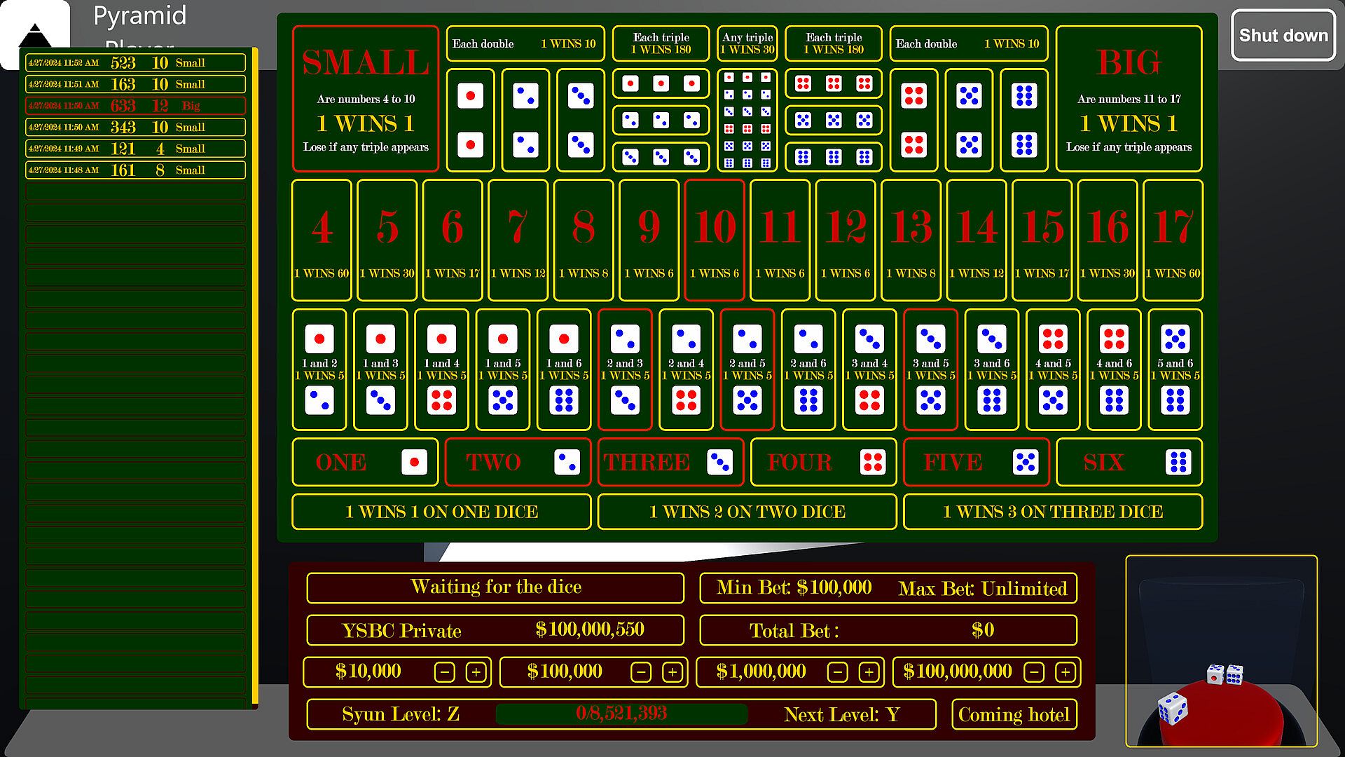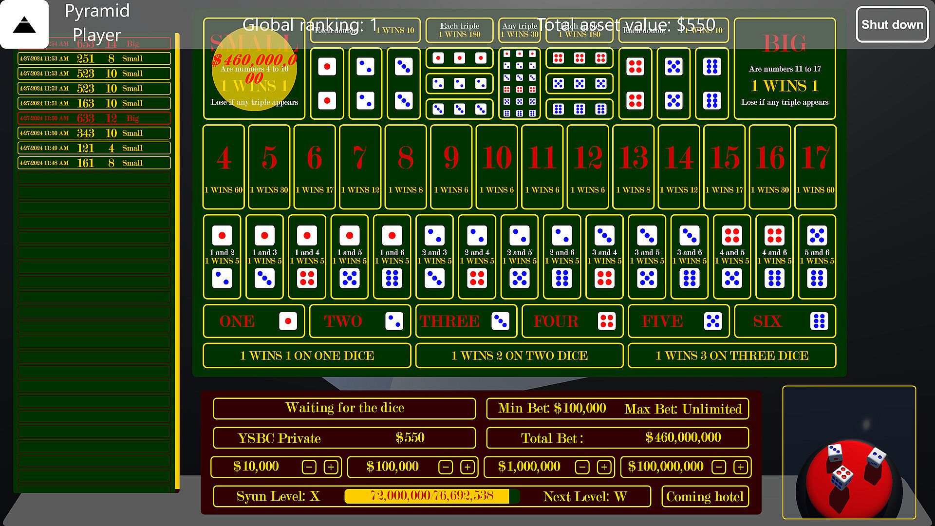 When you have enough money, you can go to the casino to grow your wealth. Why only the casino? We have considered making a savings and investment system, but no matter what we did, we eventually realized that more money will always have an advantage over less money, and it's not completely fair. Our casino system is also limited to dice and roulette, or other games controlled by a physics engine that we can think of in the future. Our casino system is absolutely fair to anyone of any wealth, through multiple completely random factors and is controlled entirely through mechanics, with no algorithms behind the scenes interfering with the results. Our purpose is to create the New World of Pyramid Game that is completely fair.