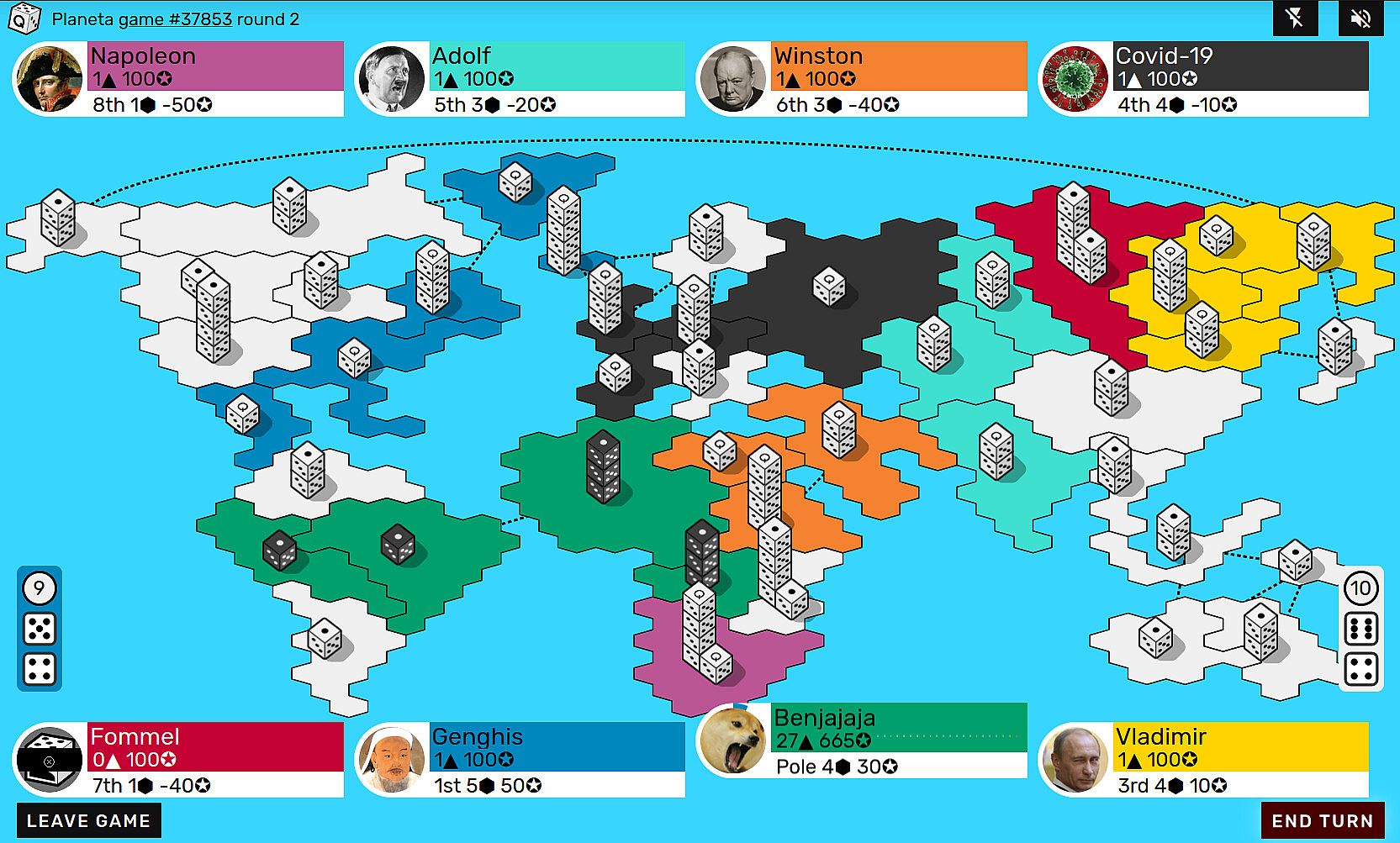 Players must click one of their lands to select it for attack, and then any of its neighboring opponent lands. Each will roll their dice against each other to determine the outcome. So lands with more dice have a higher chance of winning the attack or defense. If the attack succeeds, the land will be taken over with the amount of dice the attacker had minus one, which will remain behind. If the attack fails, the attacker will be reduced to one die.