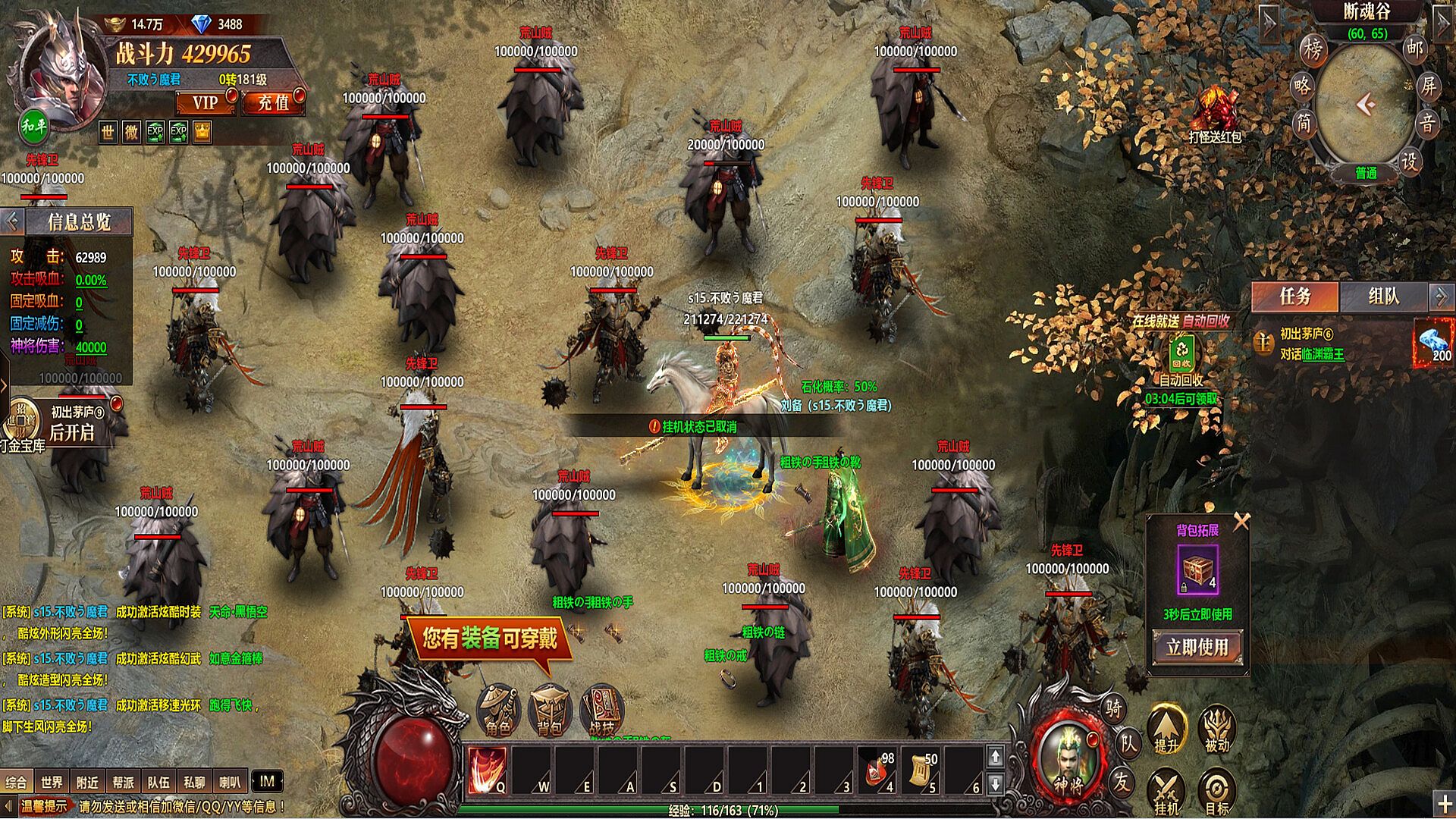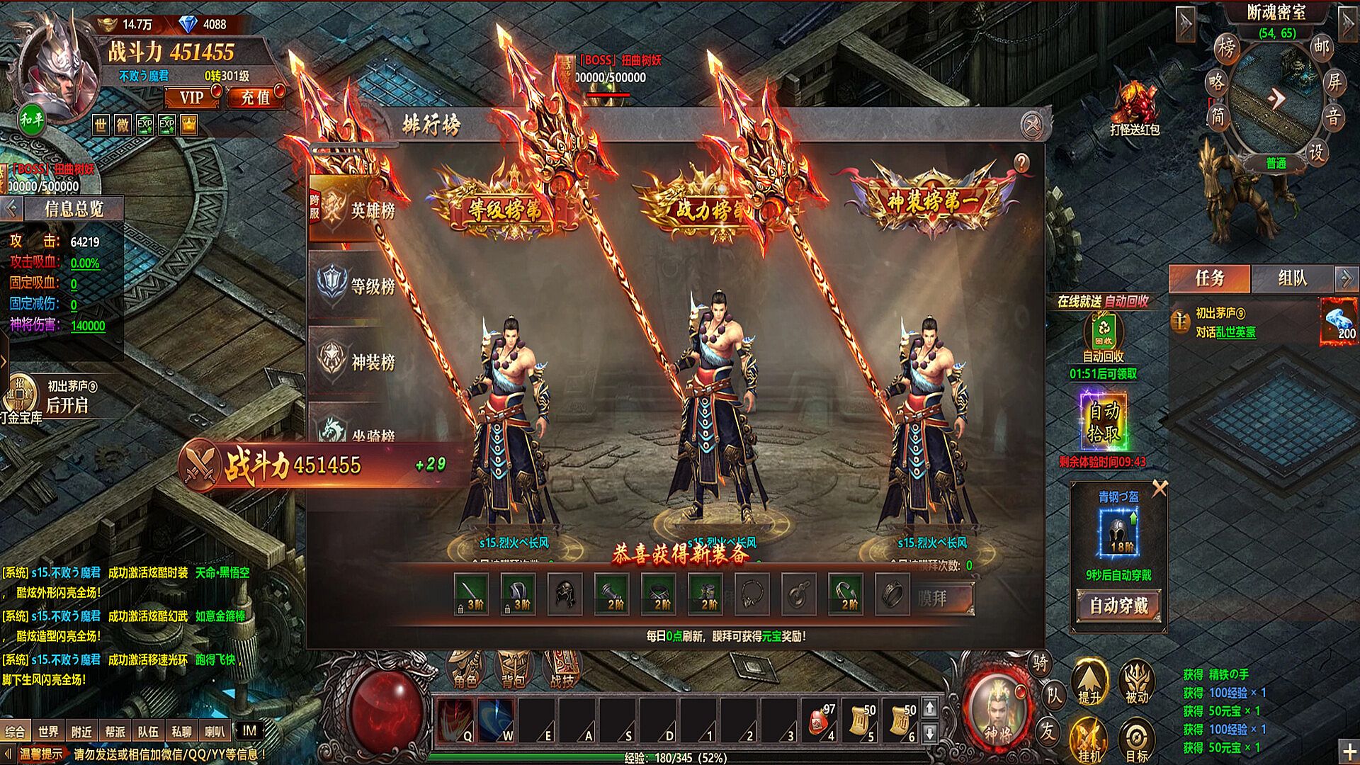 野外地图挑战各等级BOSS,击杀后领取元宝、装备等奖励。