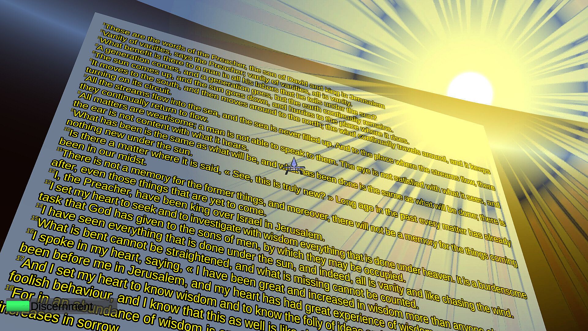 - First person: impersonate your soul that moves in your mind, at the spiritual dimension. The player status, represented by a leveling discernment bar and a morale bar, model how spiritual warfare works; the player runs on several thoughts, whose nature can be discovered only if player discernment is enough.
