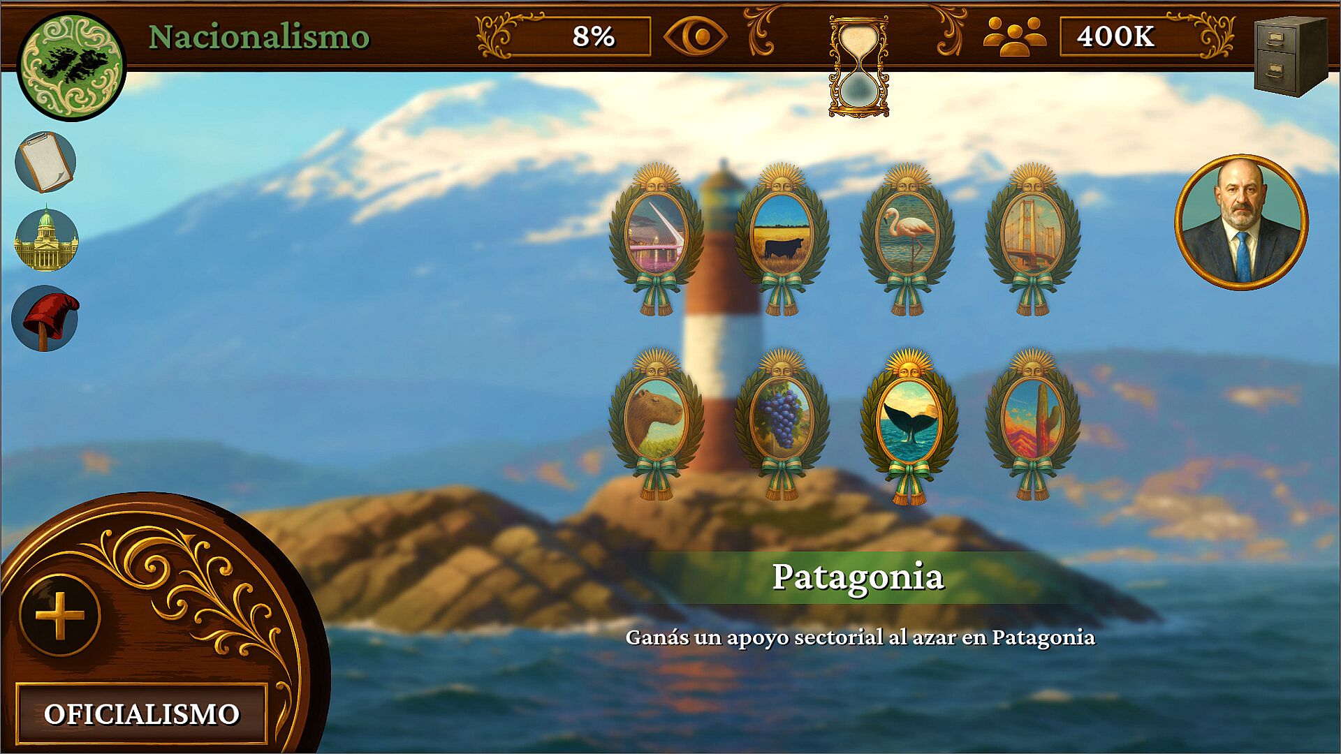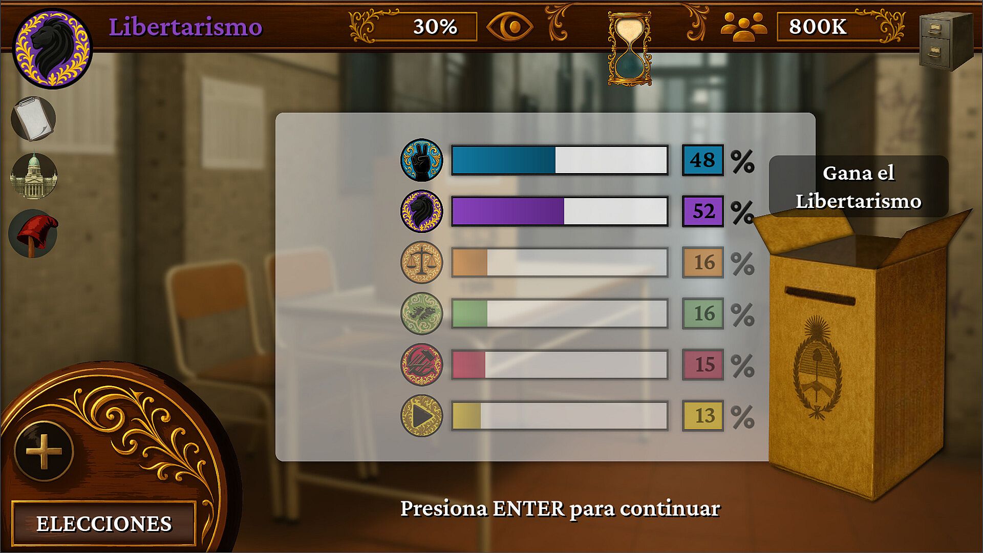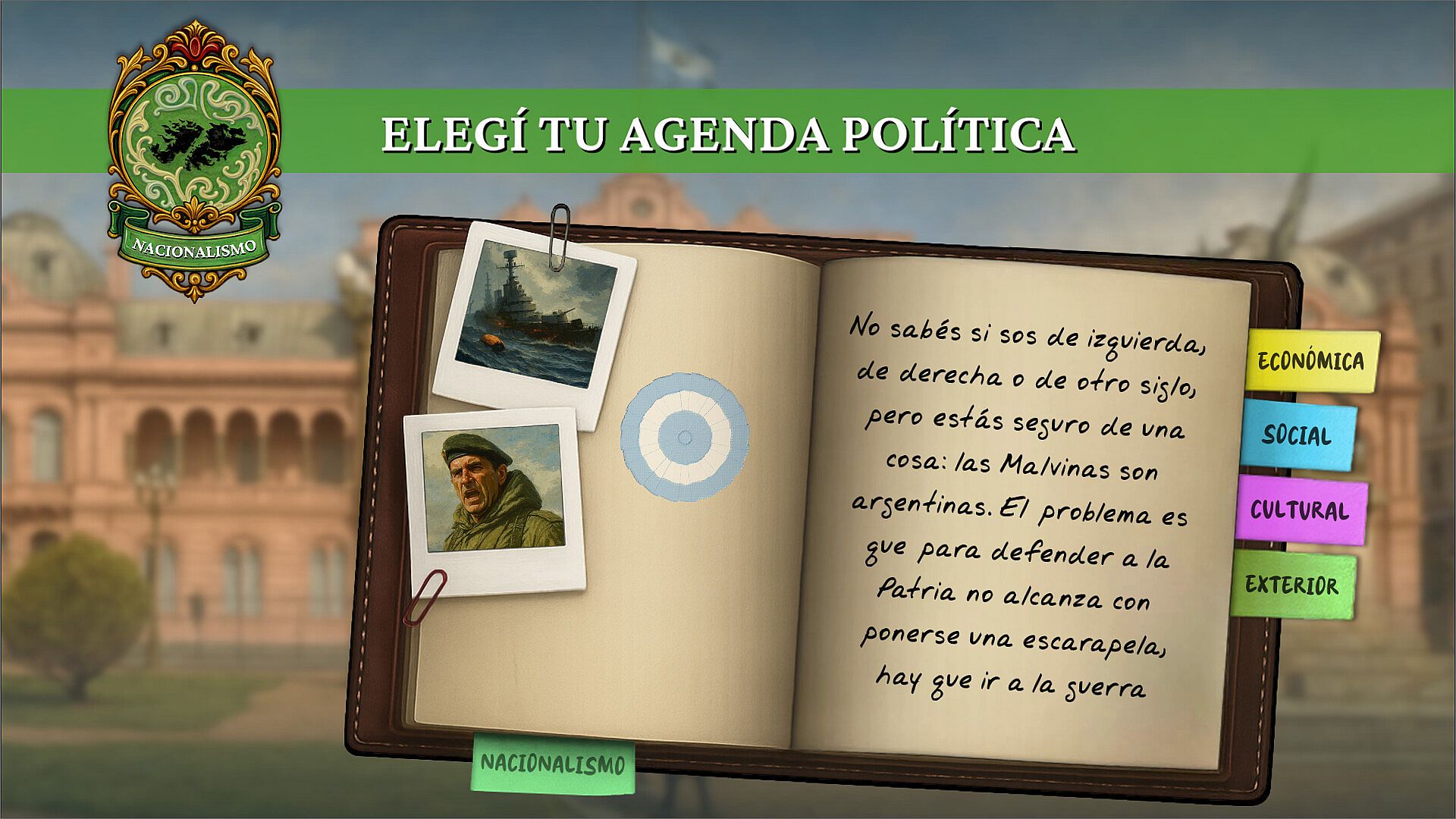 A lo largo del juego, vas a tener que tomar decisiones como si fueras el presidente de la Nación o el líder de la oposición. Cada decisión puede afectar: