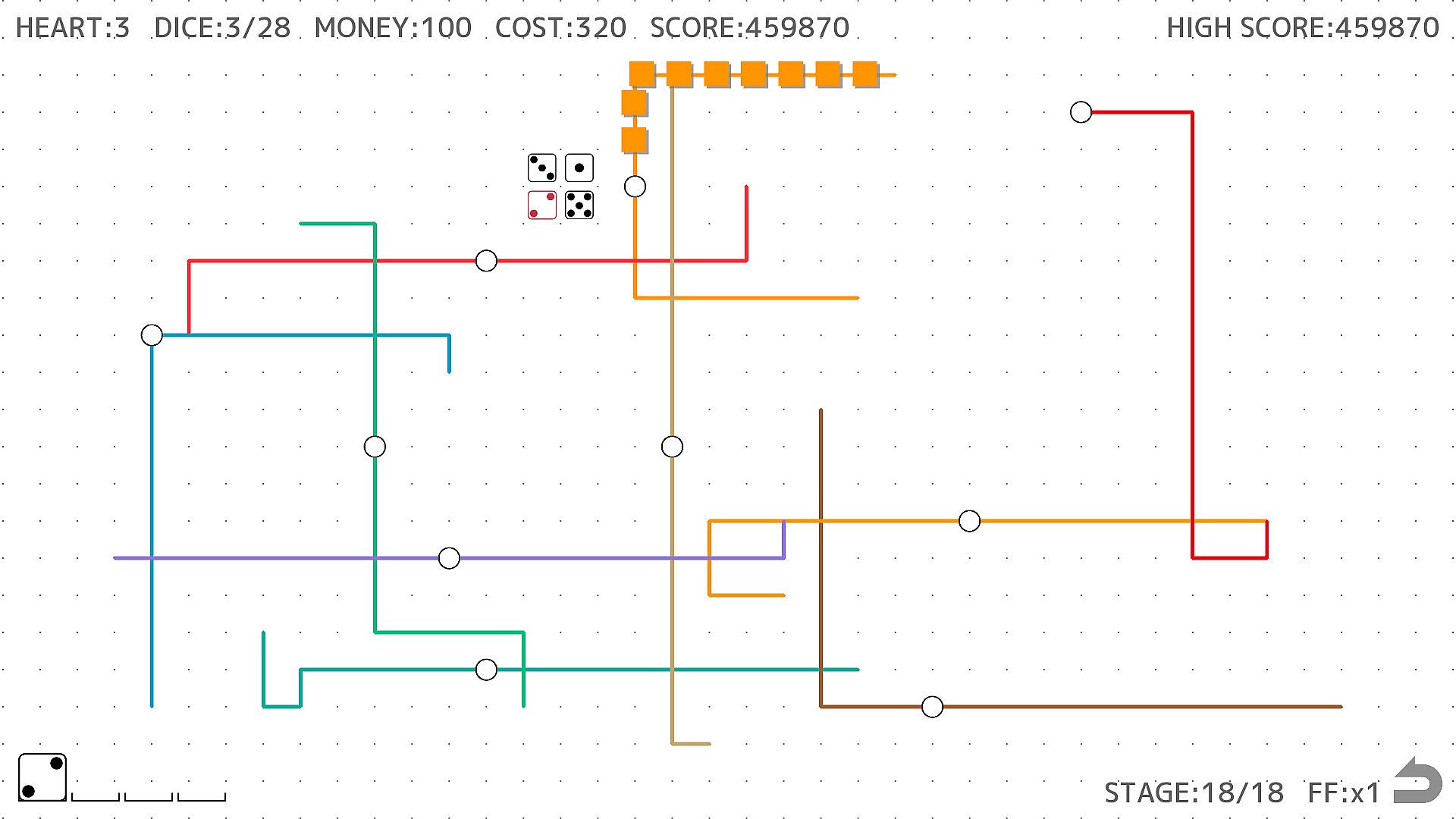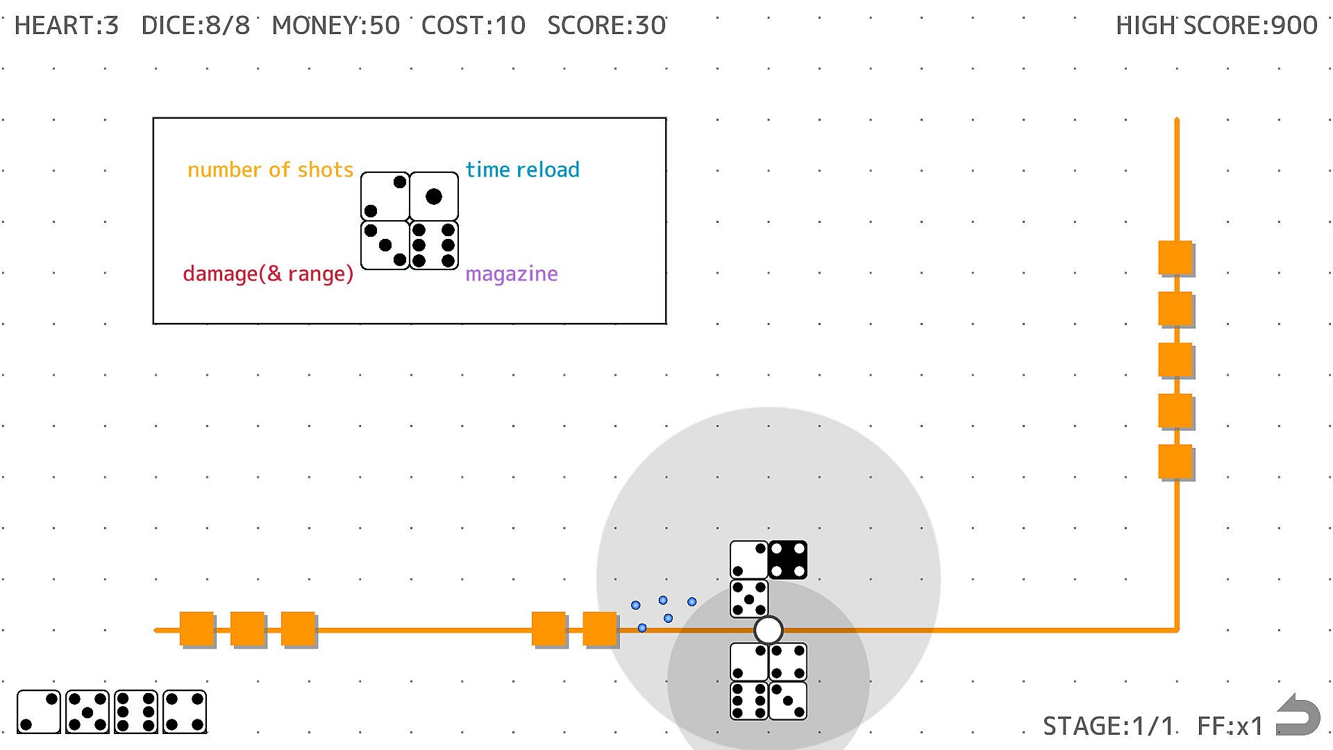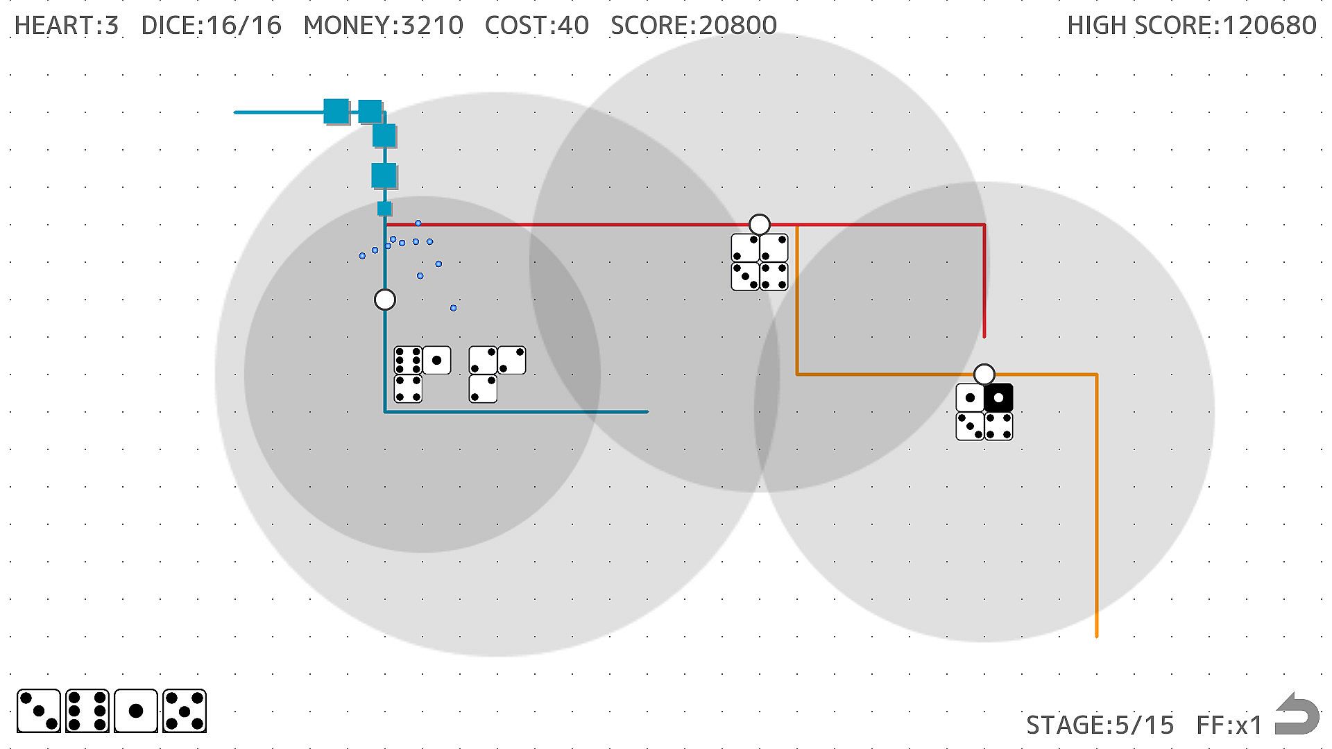 • Destroying enemies earns you money and score. It costs money to place dice, so the more money you have, the more times you can place dice.