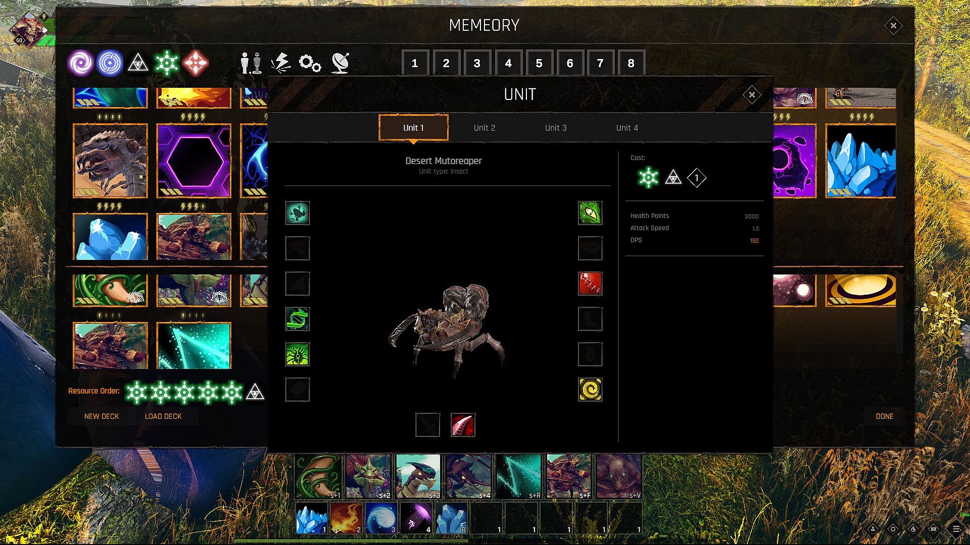 - choose a resource sequence of 15 resource points (5 resource types) that fits the deck