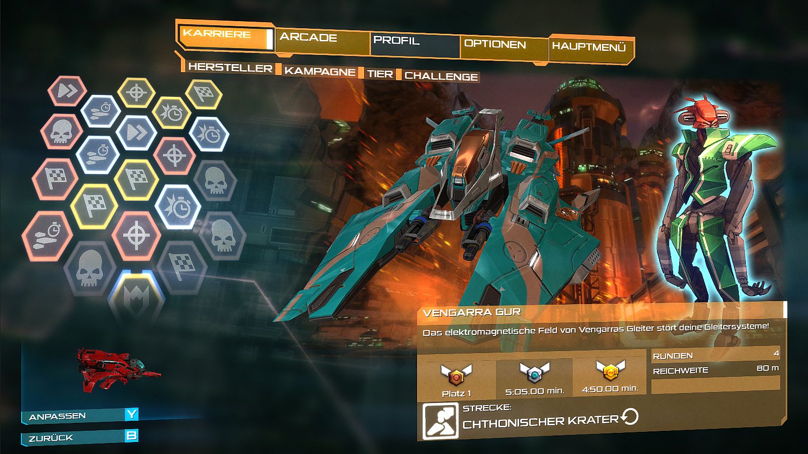 Be prepared for high-speed races against challenging AI pilots on huge race tracks on earth and in space, fight your opponents with mounted cannons and special pick-up weapons, use an extensive system for modifying and upgrading racers and fly many different racers with manufacturer-dependent perks!