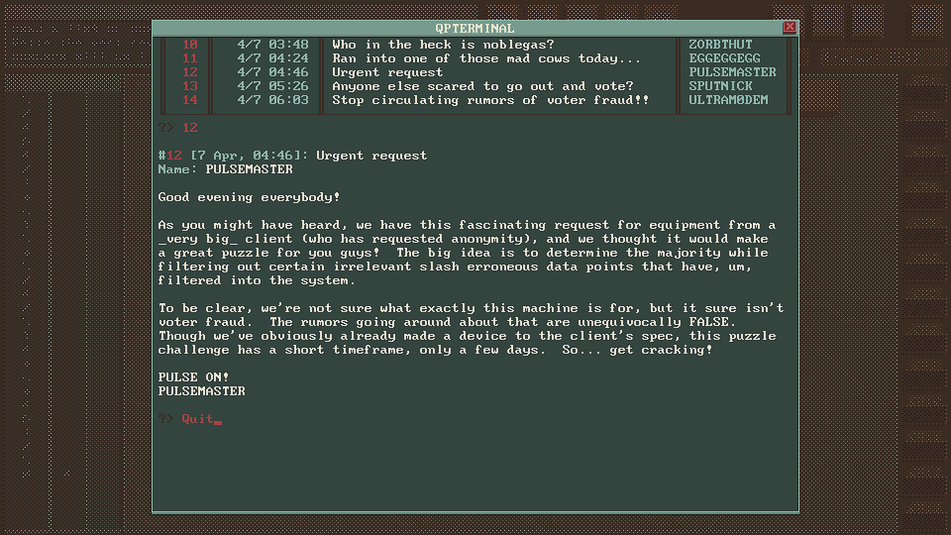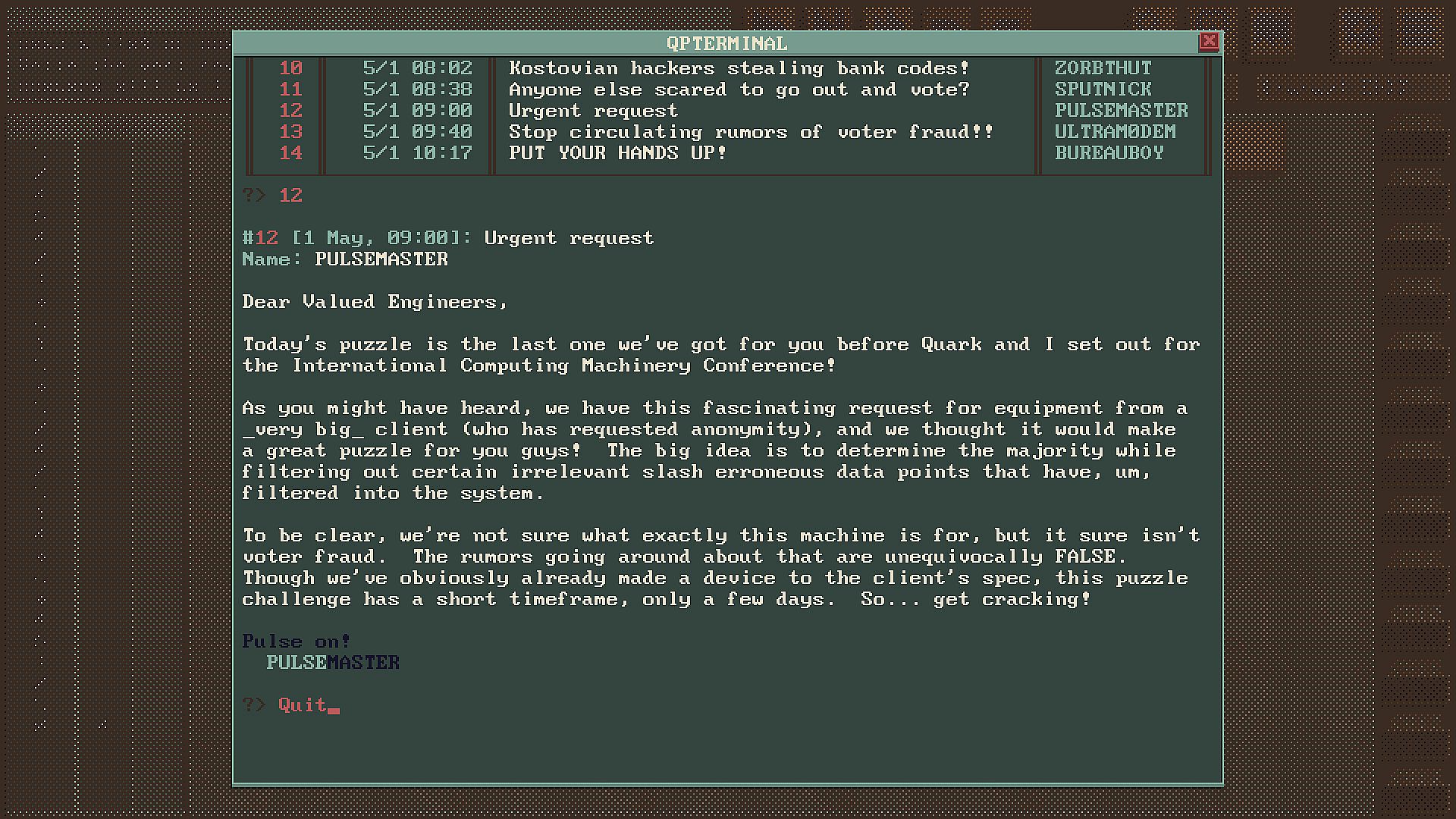 Note: Though featuring programming and set in a time when quantum physics was the hip new thing, nothing related to modern "quantum computing" is included in this game.