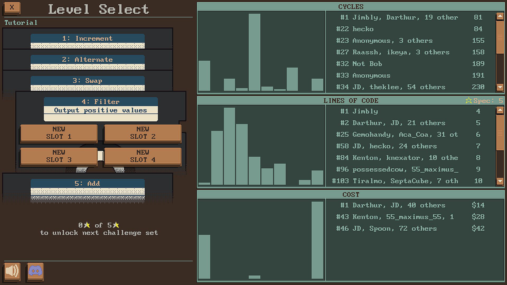 • See how your solutions stack up against your friends' or globally on the leaderboards for each of run-time, lines of code, and cost of components