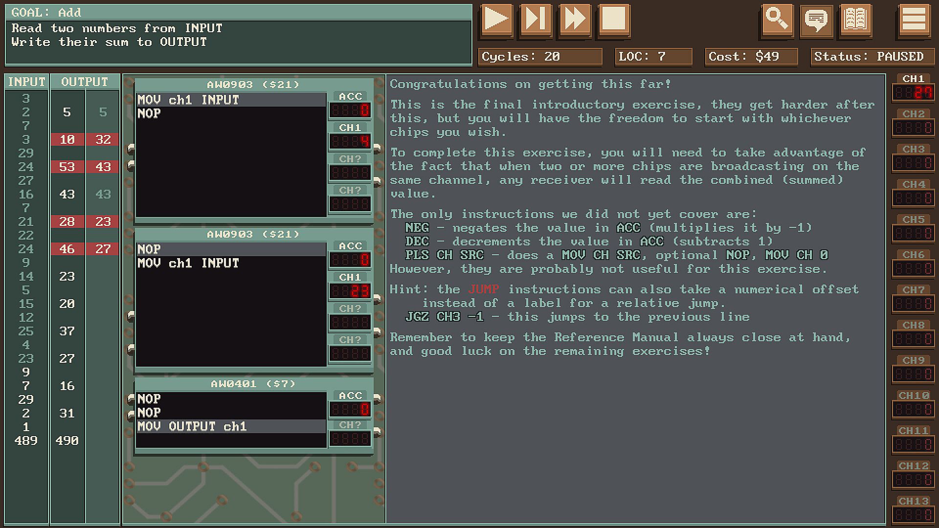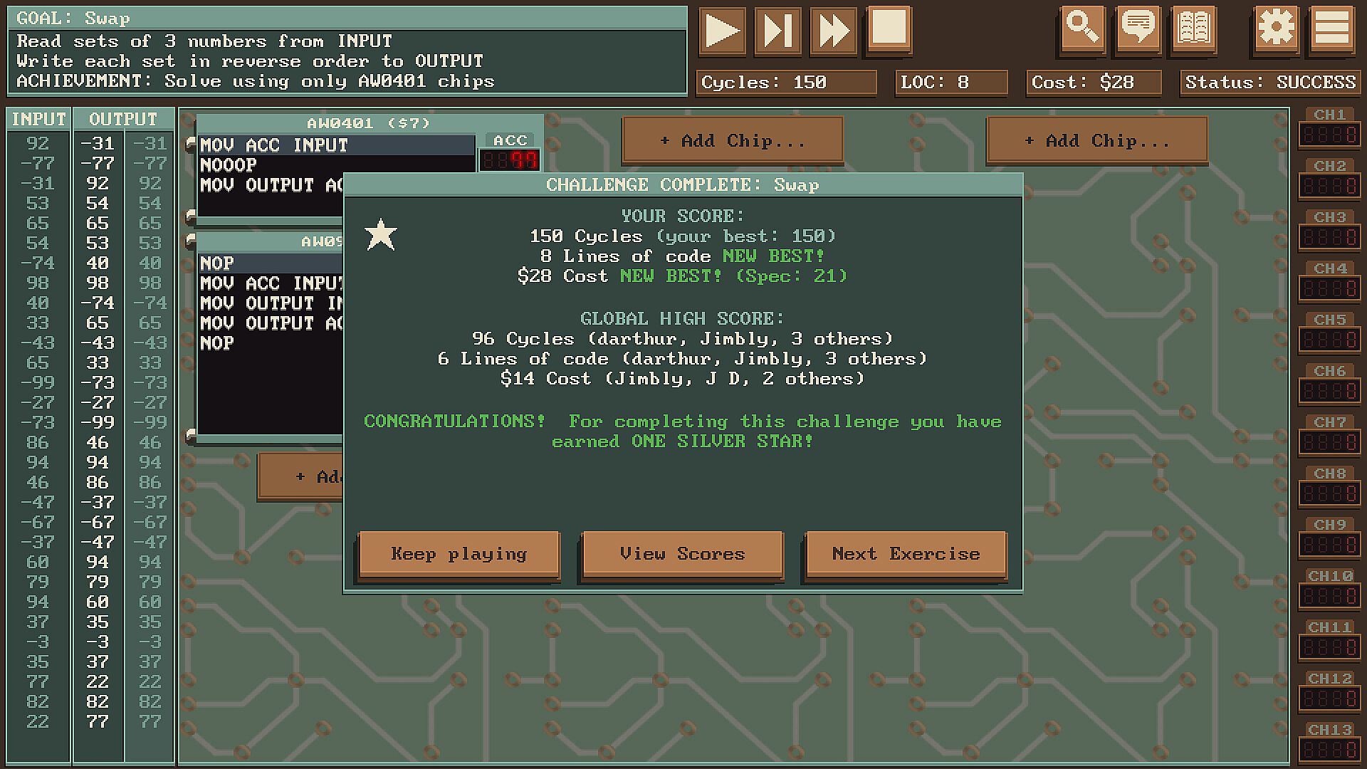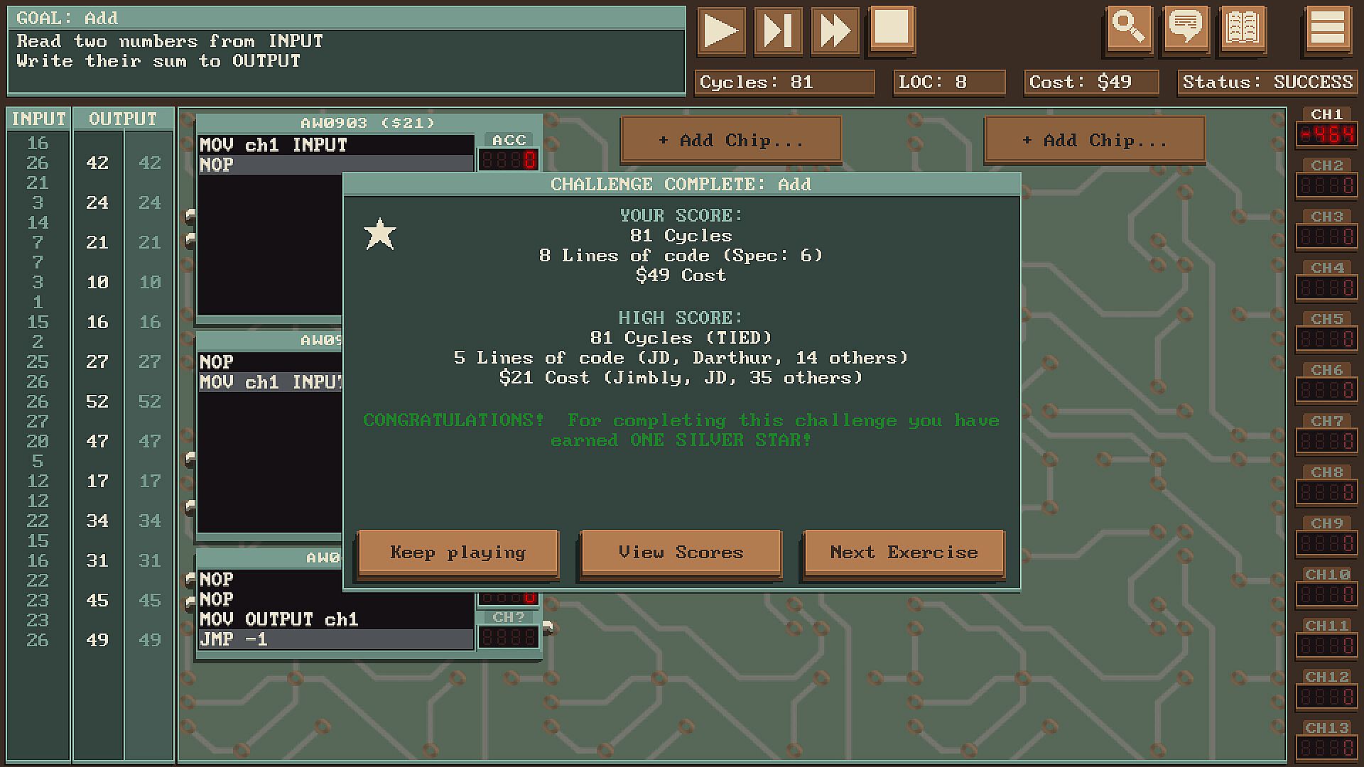 Solve programming puzzles on a fictional computer with radio-based communication and unique limitations. Competitively optimize to compete on leaderboards against friends and the global community.