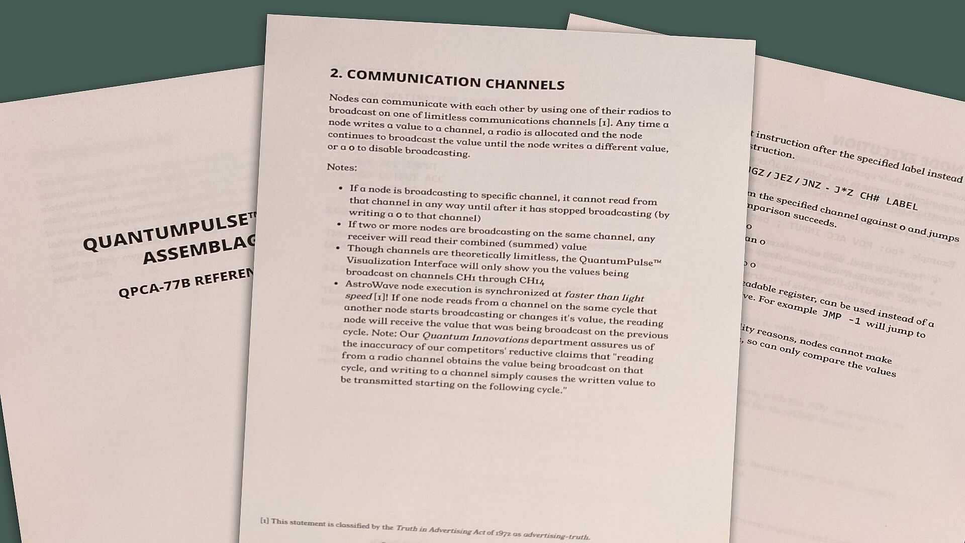• Make use of a unique fictional computing device where all communication is done by broadcasting to radio channels, and all conditional operators test values broadcast from other chips