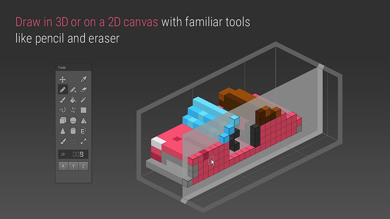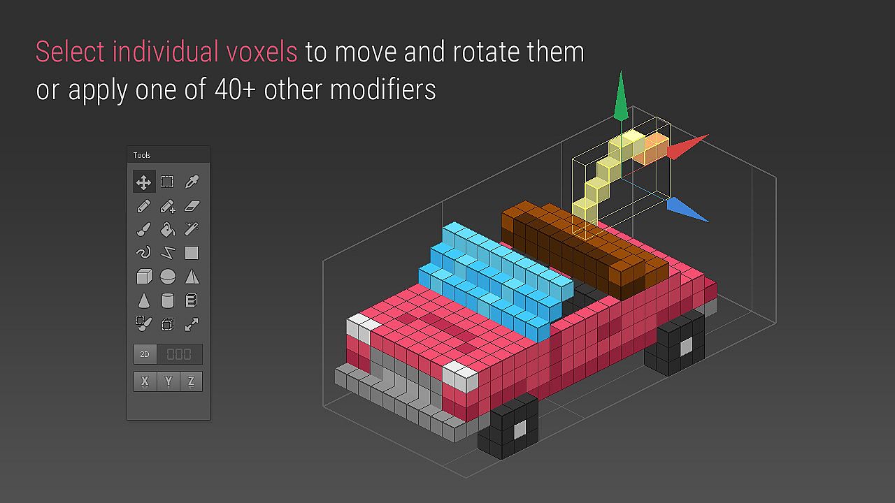 • Get 21 different tools for drawing, selecting and transforming voxels