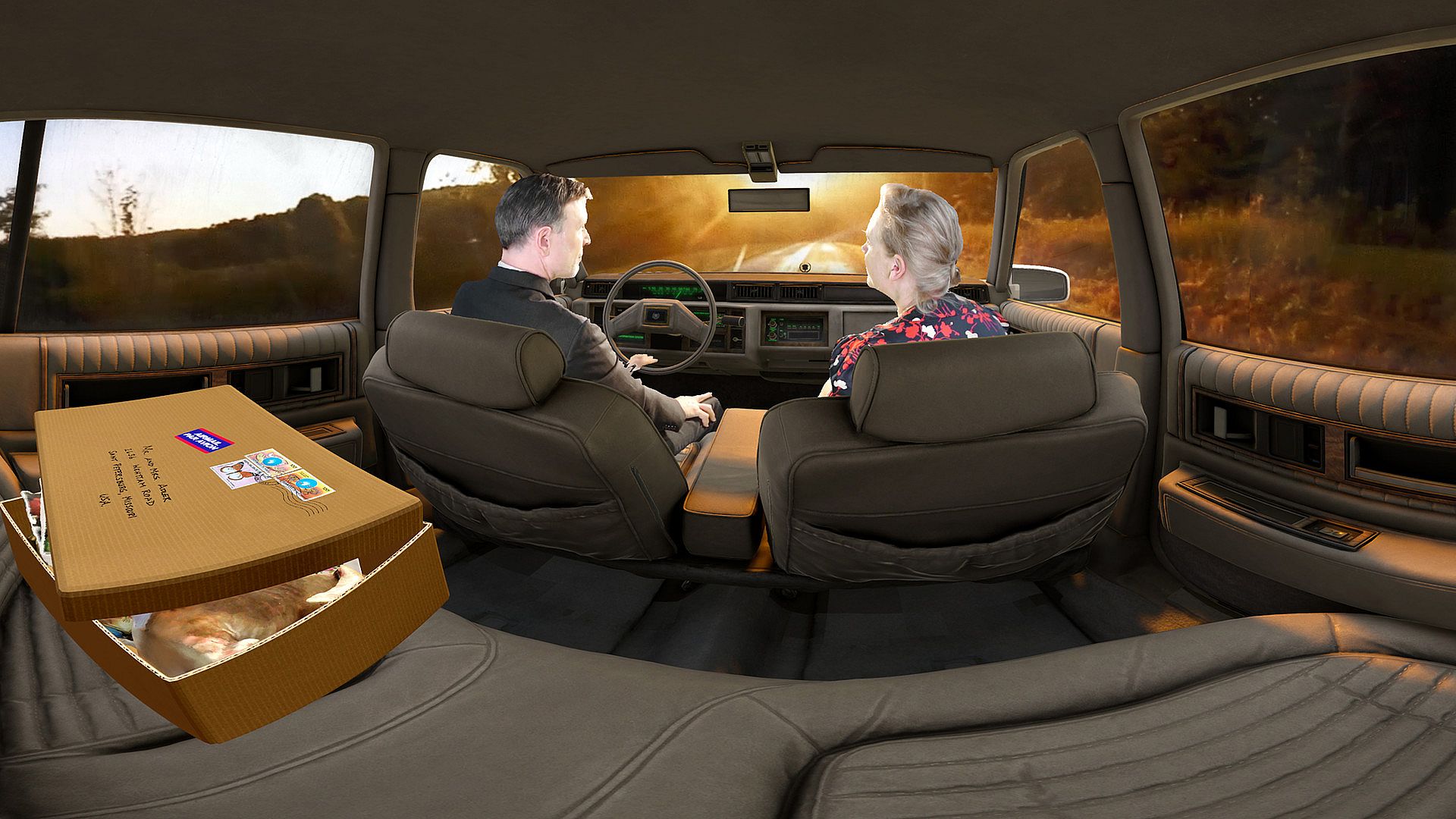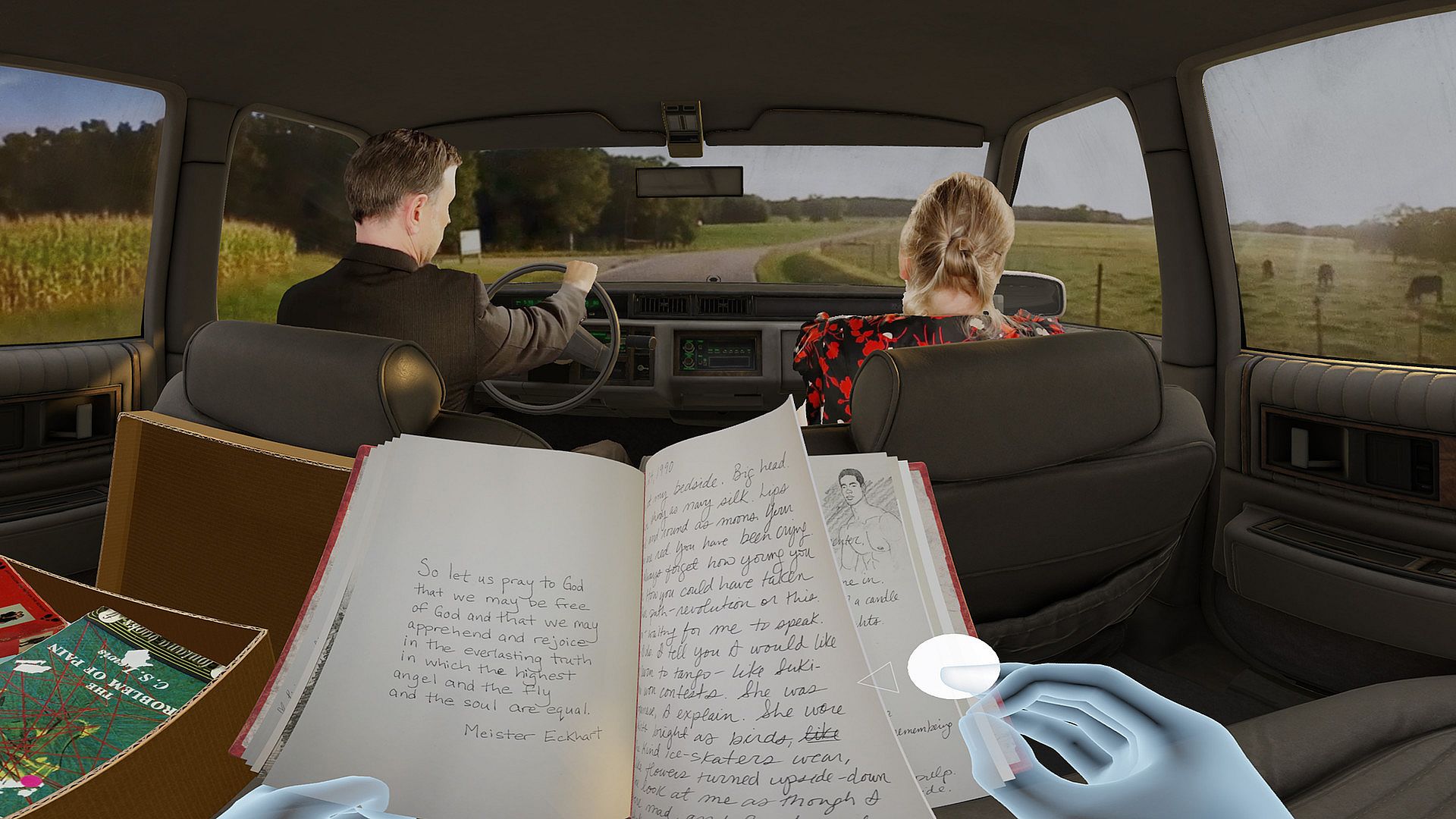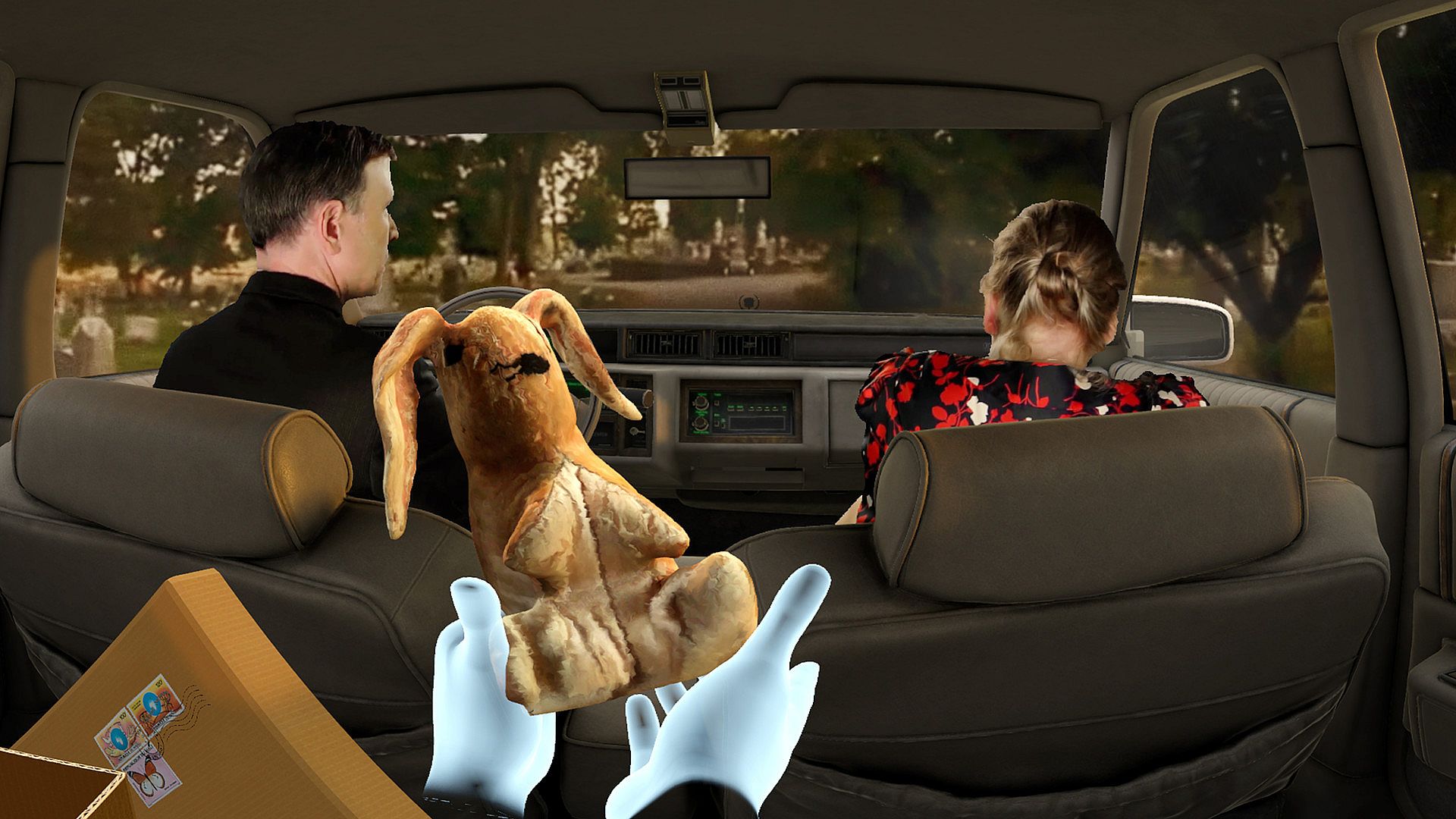 In the opening scene, you find yourself in the back seat of a vintage 1986 Cadillac DeVille behind volumetrically rendered Sebastian’s parents Ed (Drew Moore) and Mary-Helen (Hadley Boyd). It is a constrictive, oppressive environment which creates a feeling of helplessness, much like being a child stuck in the backseat of a car. Reach into the box next to you to find some of Sebastian’s belongings. Pick up and examine each object to begin reconstructing his life. Objects in the box change throughout the experience.