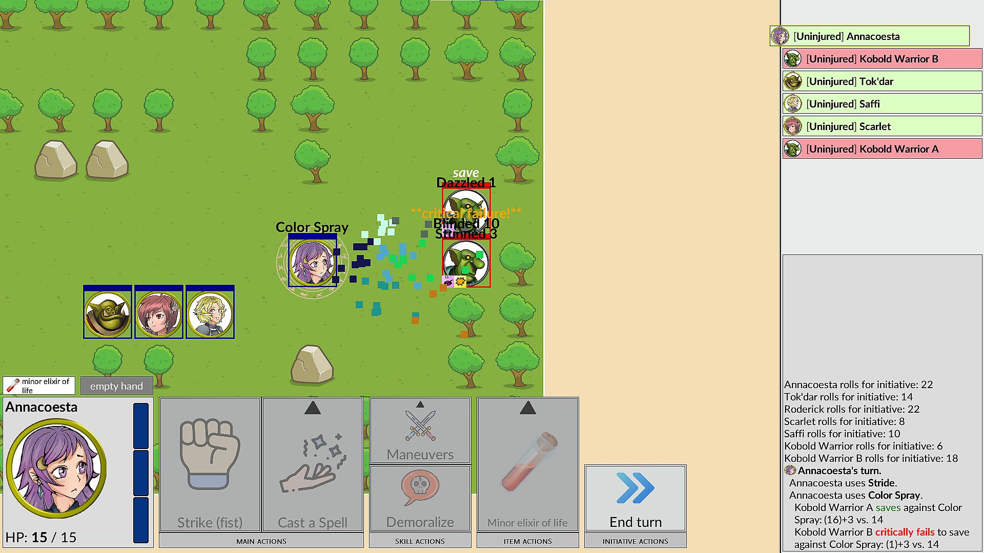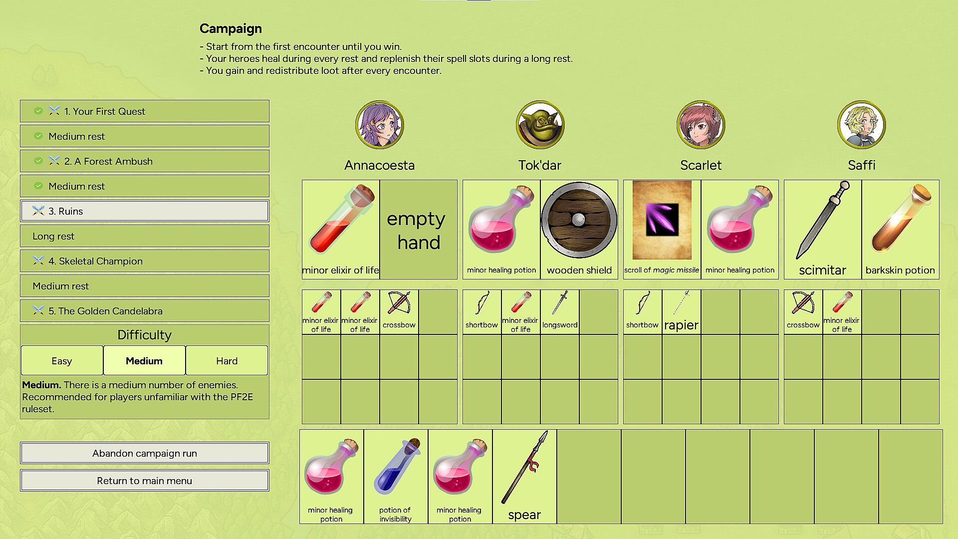 Quest for the Golden Candelabra is a 2D turn-based tactics game based on the rules of PF2E, the second edition of a powerful tabletop OGL ruleset. You lead a group of four colorful characters through a series of encounters, fighting against monsters, acquiring loot and eventually -- hopefully -- recovering the ancient artifact that's the object of your quest.