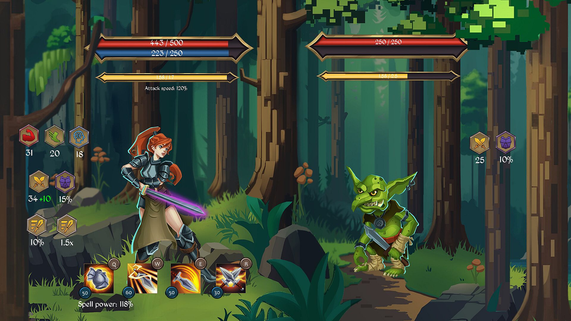 Quick semi-idle combat. Build up your stats and use spells to overwhelm your foes