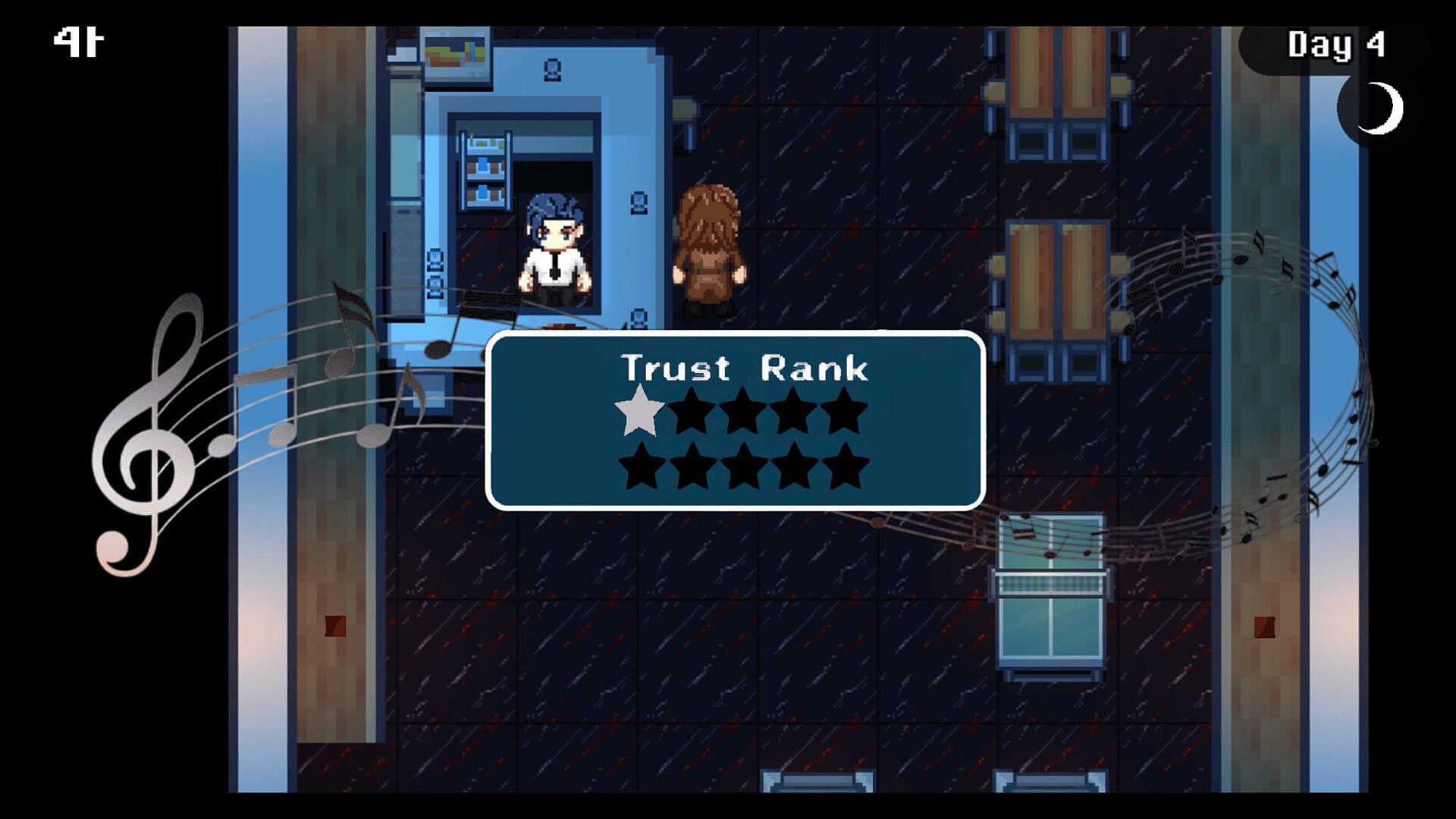 Quietus Euphony isĀ a 2D top-down narrative RPG.Ā  The player has joined a once-renowned band reeling from the suspicious death of a key member. Now isolated in a remote hotel, you must investigate the crime, build trust with the other band members, and decode the meaning behind Okami’s final song — before the killer strikes again.