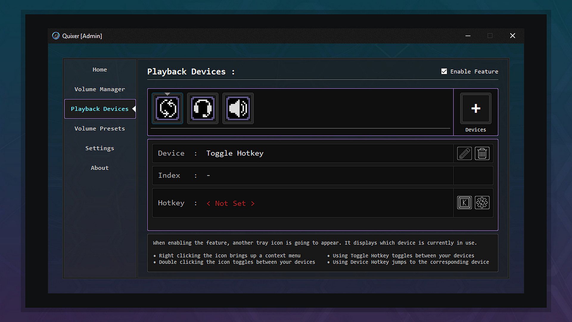 Quixer has a feature that allows you to quickly change between Audio Devices (Playback and Recording) with both hotkeys and clicks.