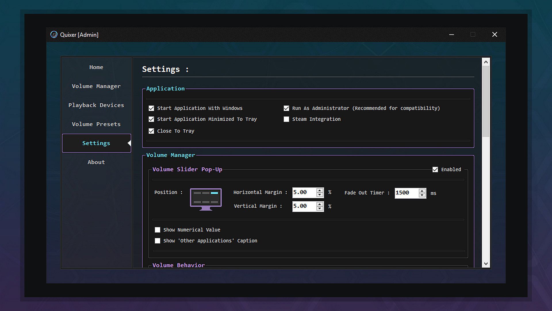 Quixer can be launched as a stand-alone (without Steam), and so there are a lot of ease of use settings. Such as Starting Quixer with Windows or Steam Integration (Displays as Playing on Steam).