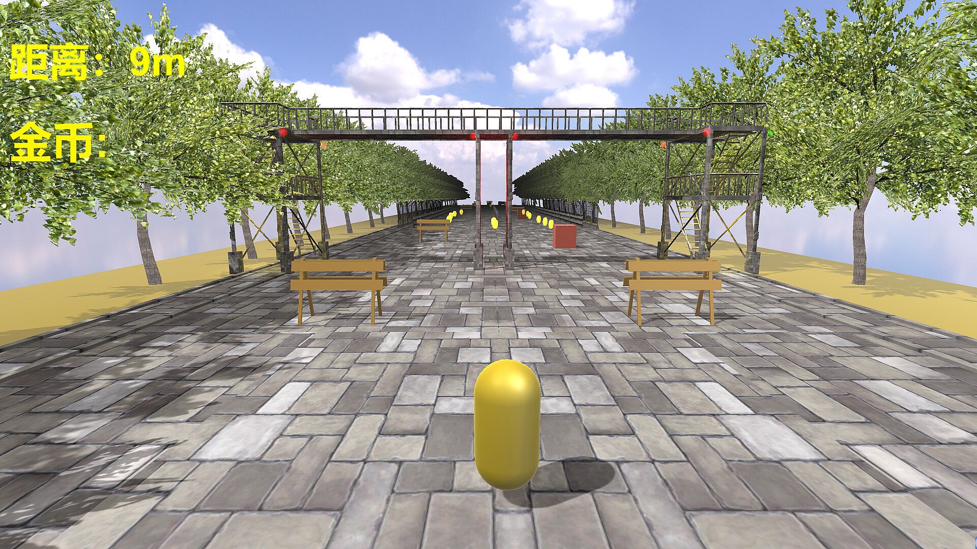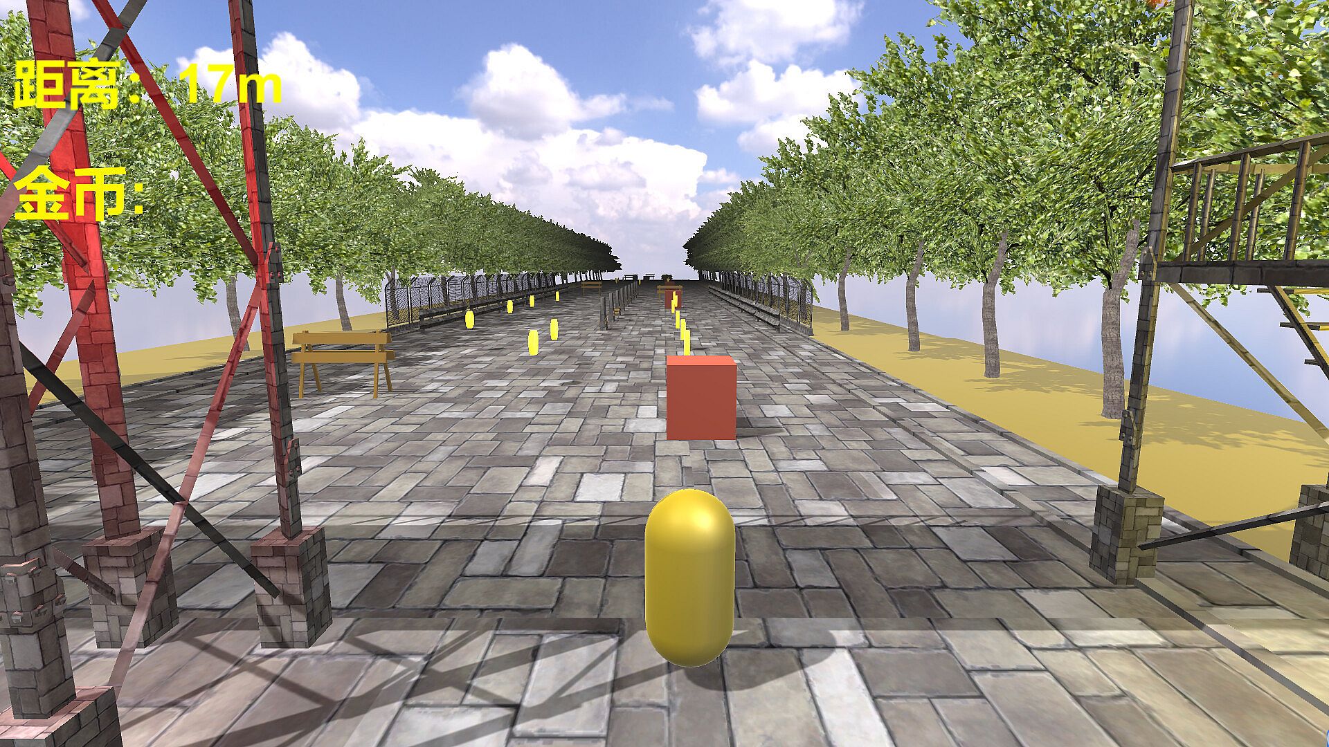 This is a fun casual running game where you control a golden capsule rolling forward on a cobblestone track. Your goal is to collect the glowing yellow coins along the way while avoiding obstacles like red blocks. Youāll also need to watch out for scene elements such as benches and scaffolding on both sides to avoid colliding and veering off the track.
