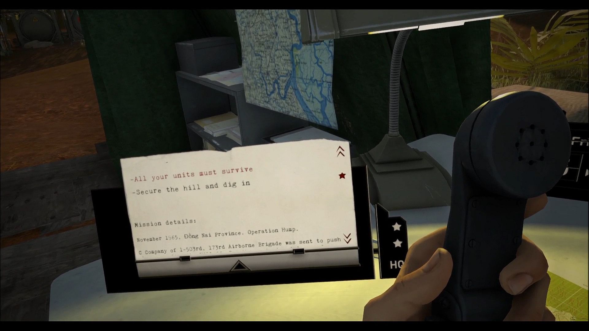 Beneath the narrative layer, hidden from your eyes, a deep and complex simulation is taking place. In Radio Commander VR every unit is described by unique set of statistics. You will have to worry about your platoons’ morale, supplies, and even their stamina. All those factors will be important during your soldiers' confrontations with enemy, unfriendly terrain and extreme Vietnamese climate. What will you do, when your choppers report, that they are out of fuel and forced to land in the middle of the jungle? Will you send the rescue mission risking the life of even more soldiers?BOND WITH YOUR BROTHERS IN ARMS