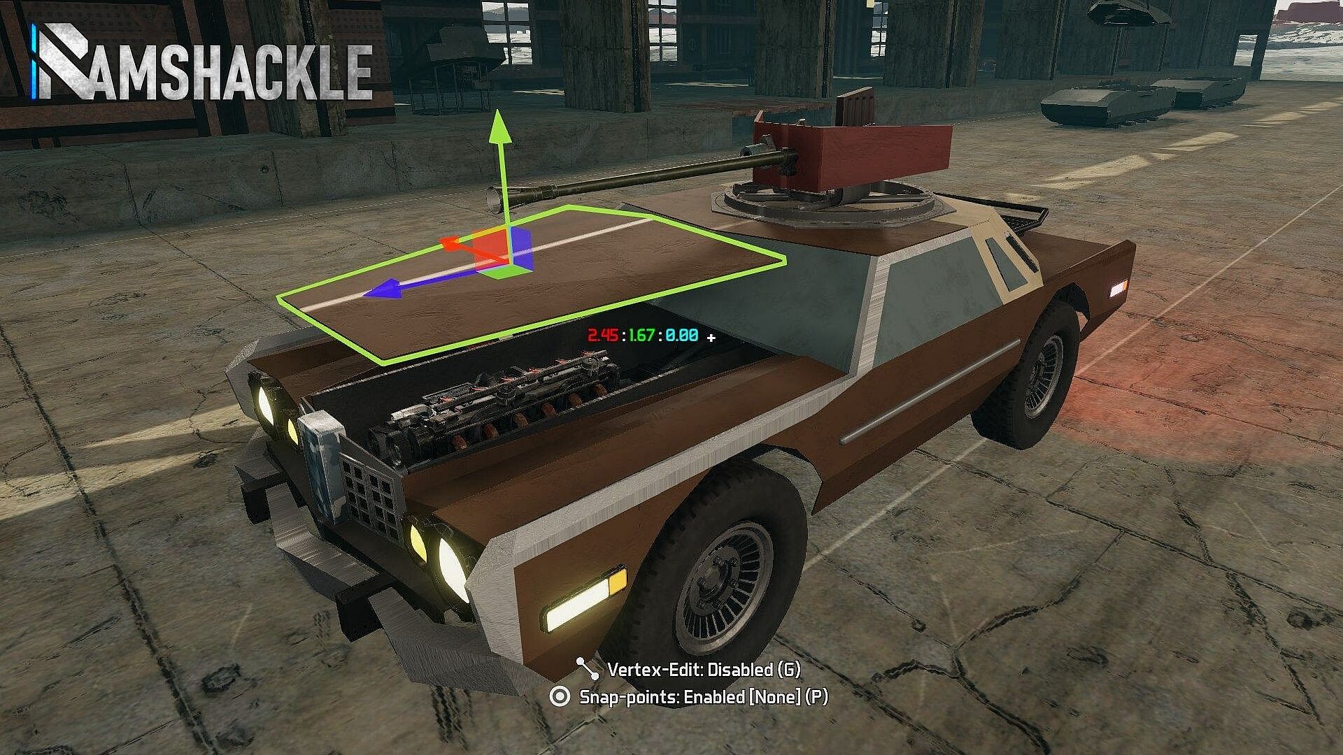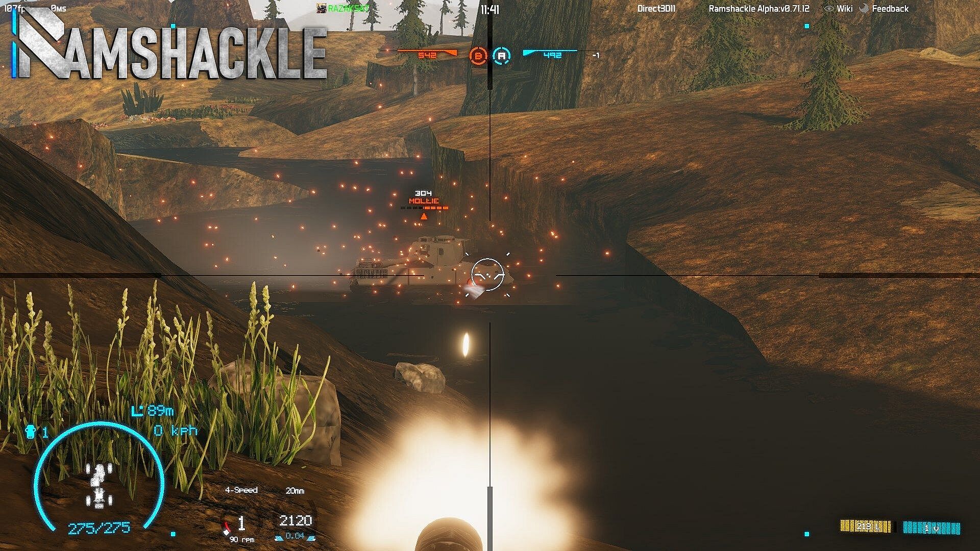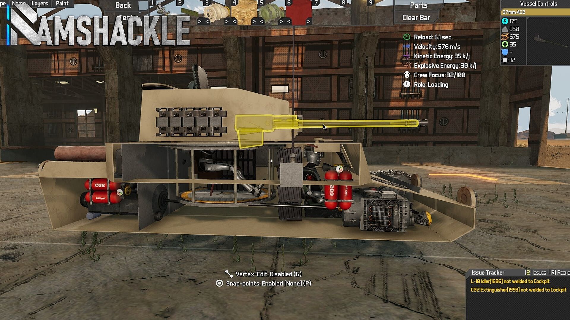 Ramshackle is a twist on the vehicular build-and-combat genre. Instead of piecing together blocks, you construct vehicles (referred to as "vessels" in-game) with point-placed struts and armor plates as the core structure. Functional modules like wheels, tracks, and weapons integrate into this framework, but they only work when powered by engines, transmission lines, and ammunition. Combat then plays out with simulated ballistics: angled armor can deflect rounds, while a well-placed shot into an ammo rack can tear a vehicle apart from the inside.