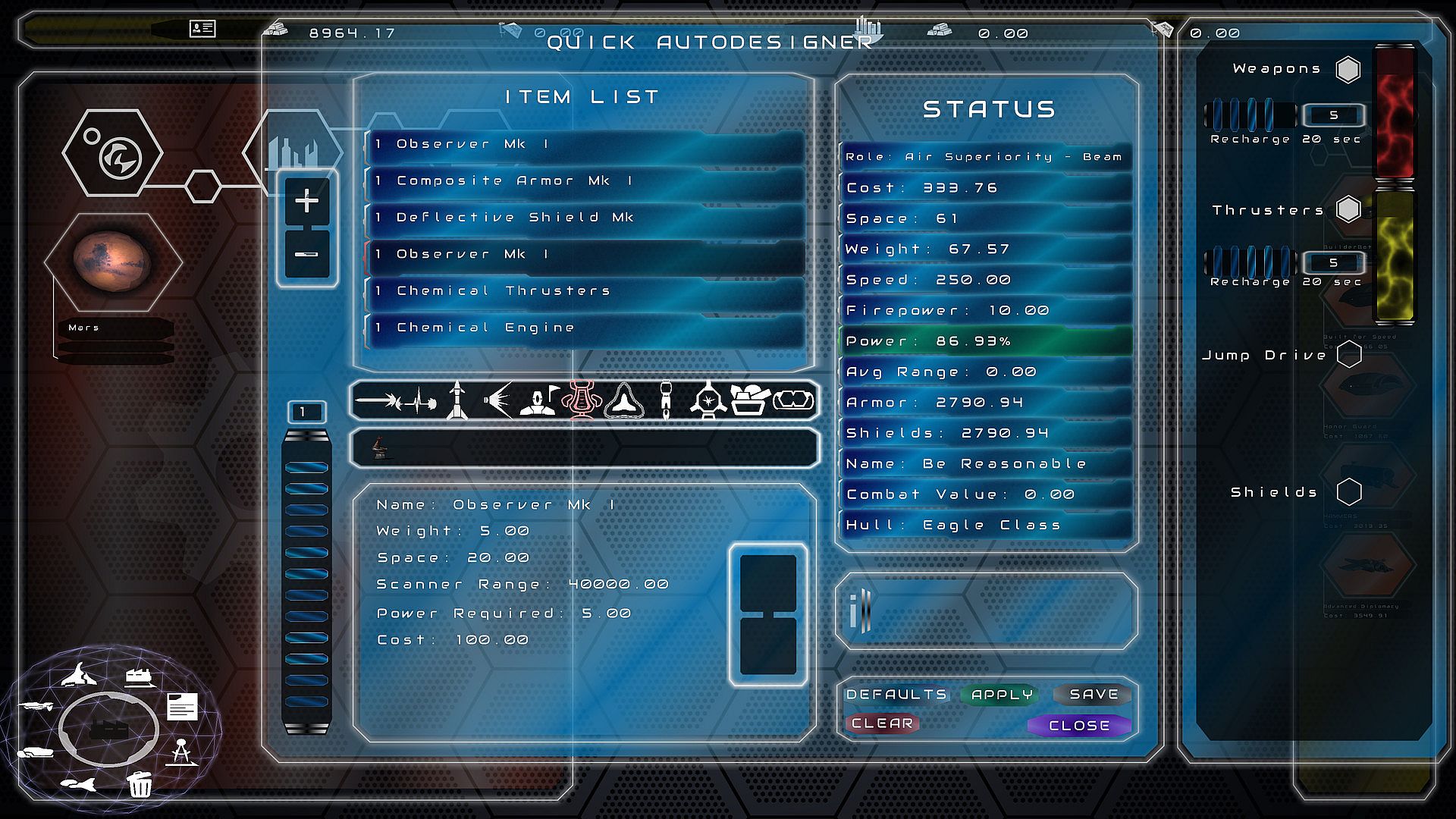 Research new weapons and components to fully customize your ships that support your strategy. Build ships manually or with the help of the auto builder. Your only limitation with placement is based on your ship's available internal space.