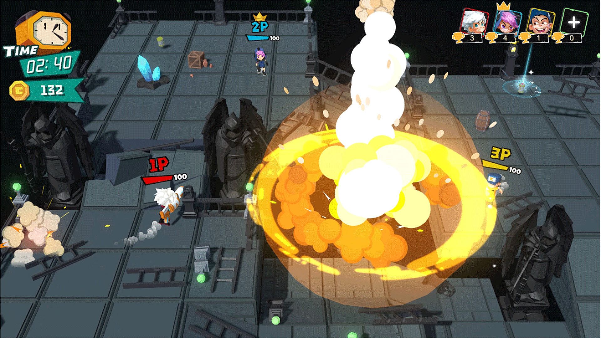 Keep the fight going on after you are knocked out, by harassing your friends with gadgets, and even stealing the party from the winner at the awarding podium. Can you hold on to that trophy?