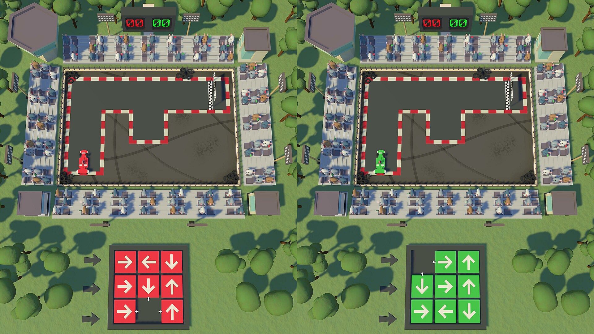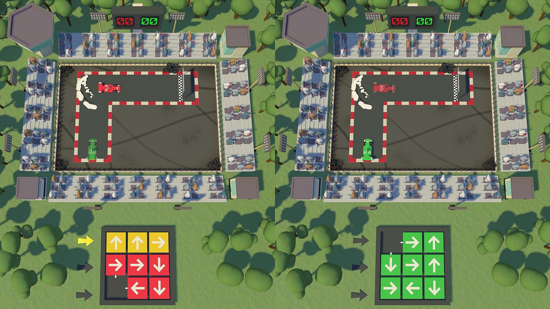 In this crazy sliding race game 2 players compete to cross the finish line first. Each player slides the puzzle pieces in the right sequence, the arrows dictate the direction the car will go.
