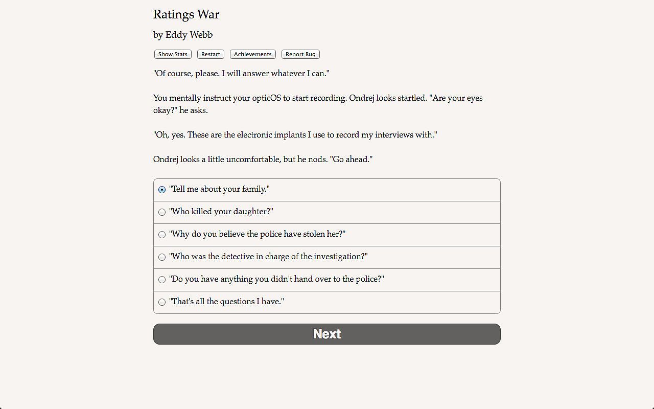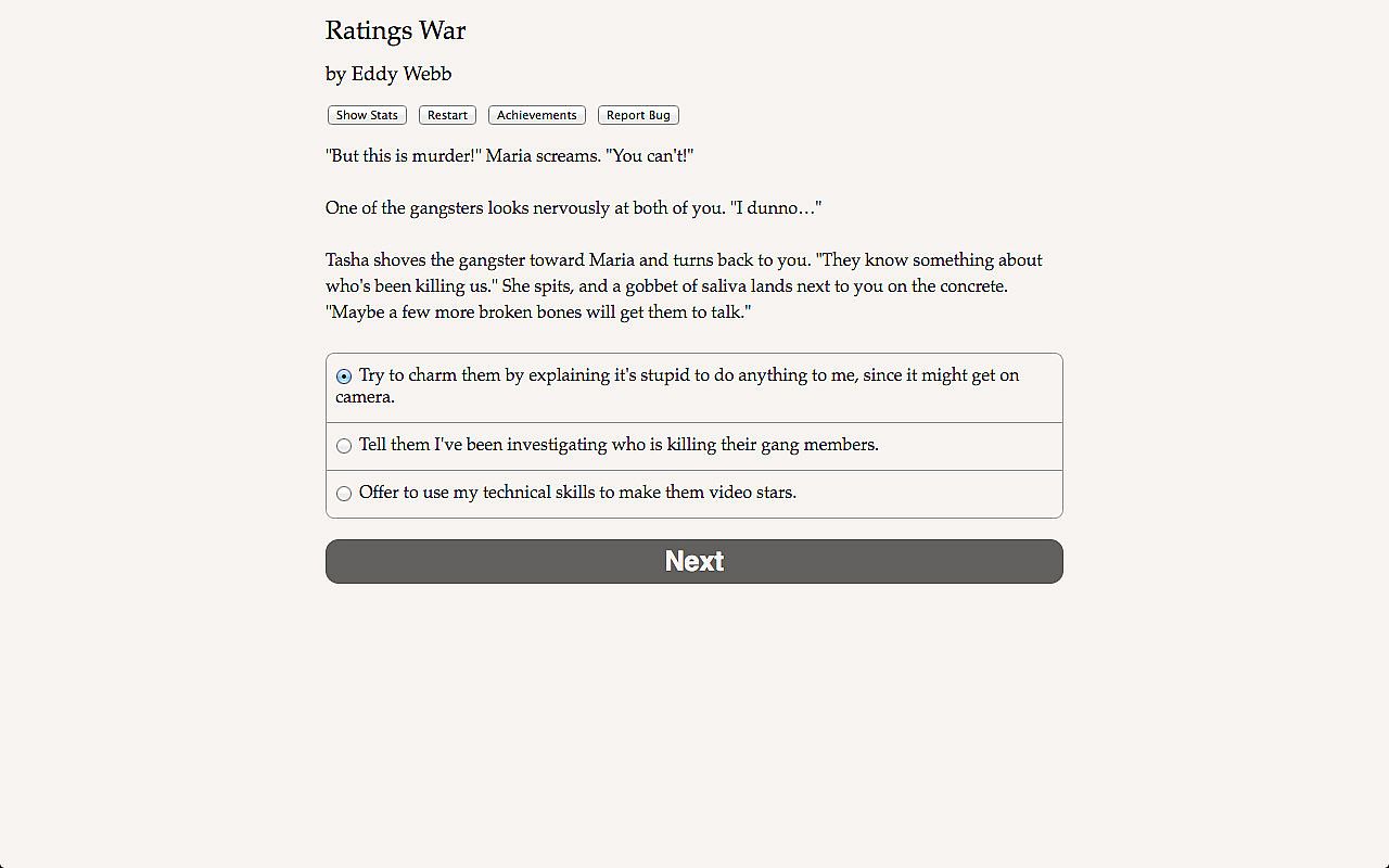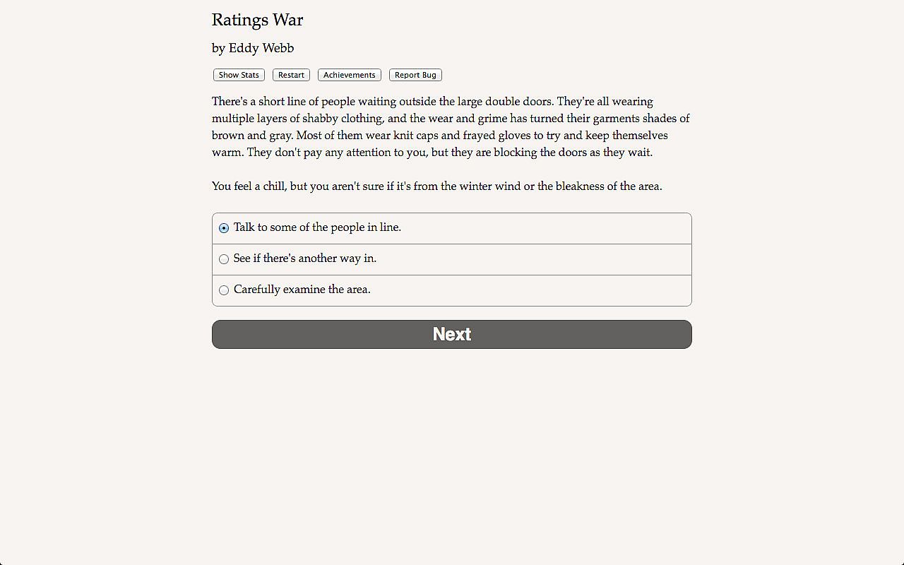 "Ratings War" is a thrilling 80,000-word interactive novel by Eddy Webb, where your choices control the story. It's entirely text-based--without graphics or sound effects--and fueled by the vast, unstoppable power of your imagination.